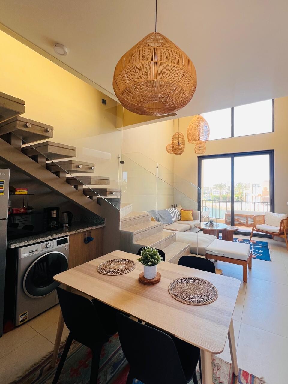 Velkommen til den boho-chic loftsleiligheten med to soverom i Tawila, Gouna. Loftsleiligheten vår har utsikt over en vakker lagune i en høyere foss og et delt basseng. Loftsleiligheten har en smart LG 65-tommers TV, mikrobølgeovn, kaffetrakter, gasskomfyr og kjøleskap. Takterrassen er designet i moderne stil med en lett sofa. Huset ligger godt til i sentrum av Gouna, i det nyutviklede og berømte boligområdet Tawila. Gourmet-supermarkedet ligger innenfor gangavstand, rundt tre minutter.
