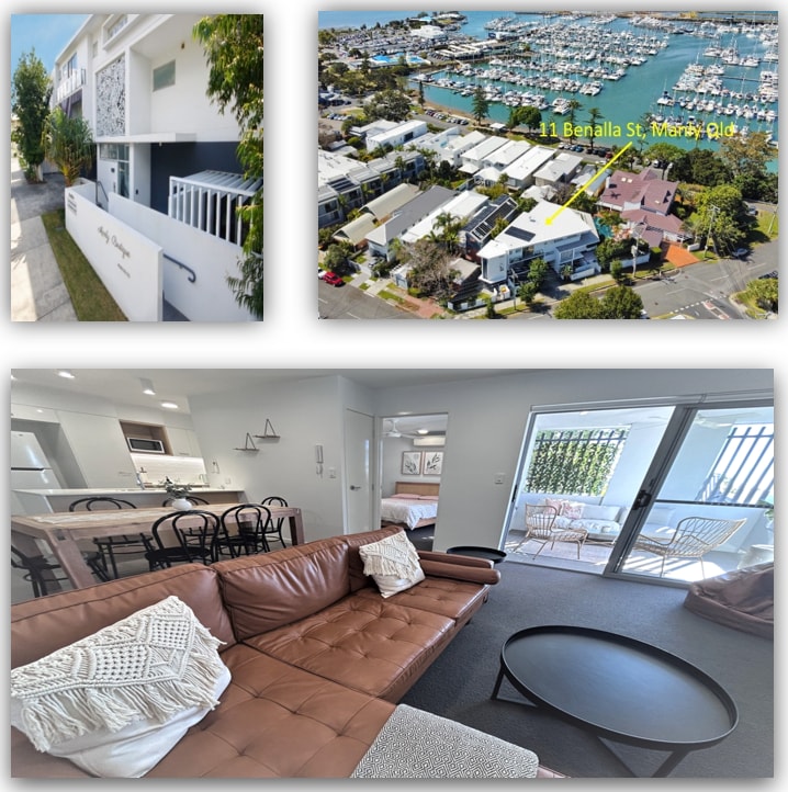 15 år gammel leilighet på 156 kvadratmeter, nylig pusset opp, i utmerket stand. Tre soverom med to kingsize-senger, ett soverom med en queensize-seng, og to og et halvt bad. Aircondition og vifter på alle soverom og i stuen. En flott livsstilsleilighet. Trådløst nettverk, 85 tommers smart-TV, svømmebasseng og sauna. Balkongen er av god størrelse og har utsikt over Raby Bay. Grill og utendørssalong på balkongen. Klesvask utstyrt med vaskemaskin, tørketrommel og strykejern. Undergrunnsparkering for én bil. Kaffemaskin, bare tilsett melk.