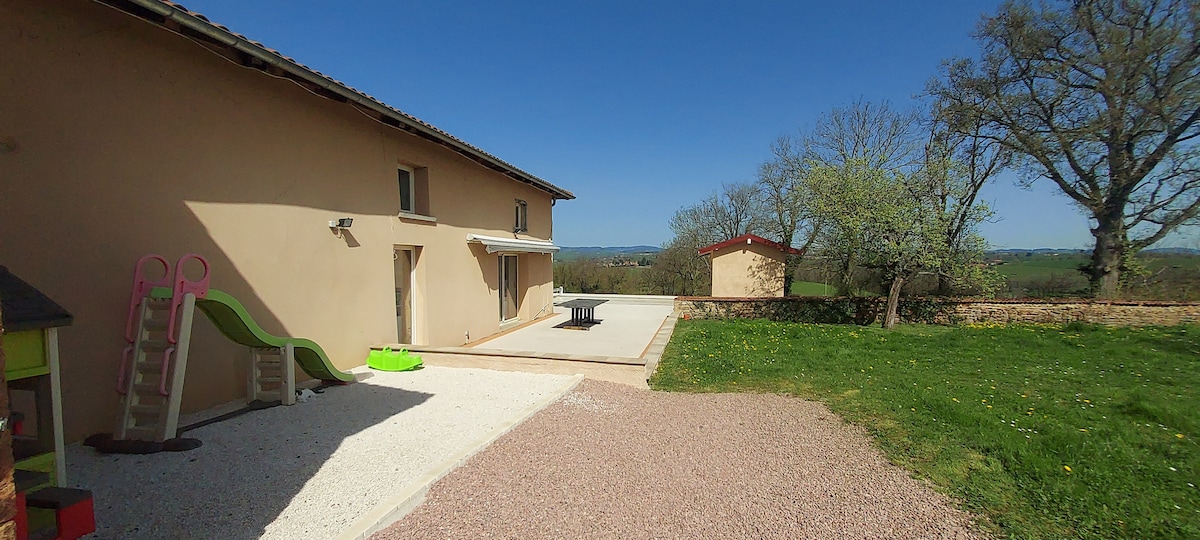 Varmt og rolig landsted. Nyt et opphold i naturen med en åpen utsikt over naturen. Til din disposisjon, på 2 nivåer, 2 soverom med dobbeltseng, en dobbelt sovesofa og to enkeltsenger på loftet. Tilgang til turstier direkte fra boligen. Kom og lad opp batteriene og nyt nærheten til Beaujolais-regionen.