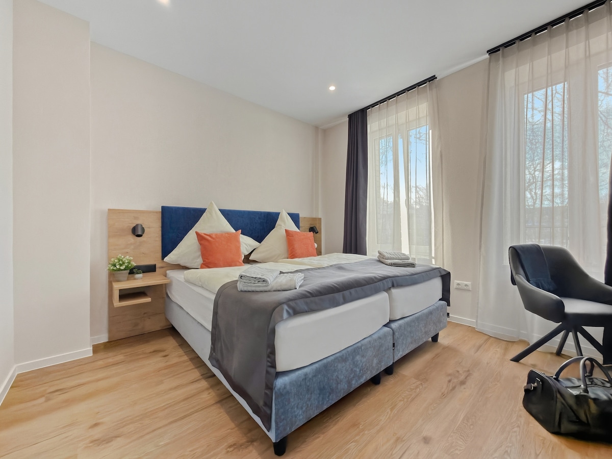 De romslige dobbeltrommene våre på opptil 35 kvm tilbyr betydelig mer plass enn vanlig – ideelt for å ankomme og føle seg bra. Mange rom har balkong med utsikt over havnen, noe som gir en avslappet atmosfære. Eiendommen ligger sentralt i Kiel, bare fem minutters gange (ca. 500 m) fra Kiel sentralstasjon – perfekt for byreisende, forretningsreisende eller korte opphold.