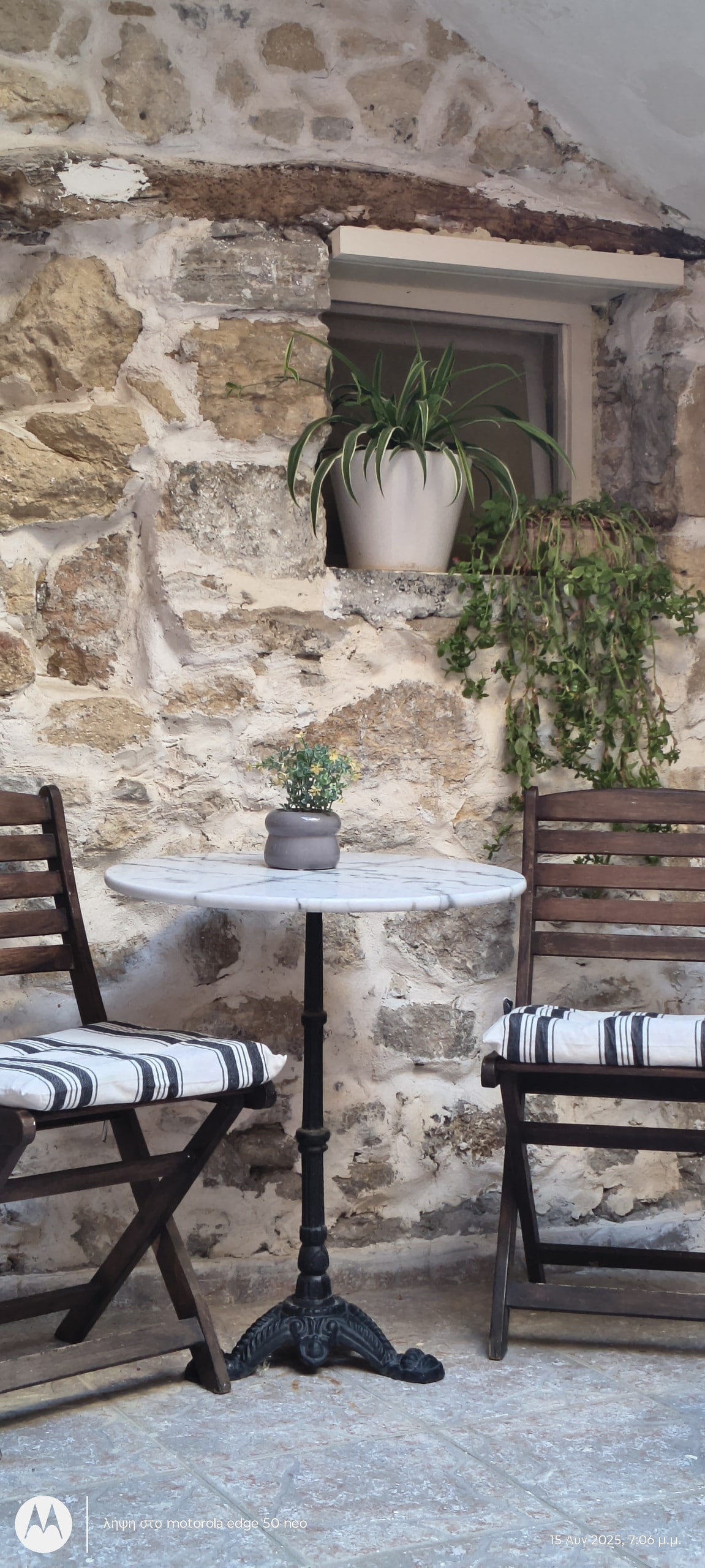 Denne stilige leiligheten ligger i utkanten av landsbyen. Stallene til den tidligere hestegården Melanouri ble forvandlet til to vakre leiligheter (Melanouri Apartments), og sjarmen er fortsatt der. Det inviterer til å slappe av, bo og lage mat. Badet har en regndusj og god plass til kroppspleie. Ute kan du dagdrømme eller spise under to store oliventrær. Du kan parkere på tomten vår.
