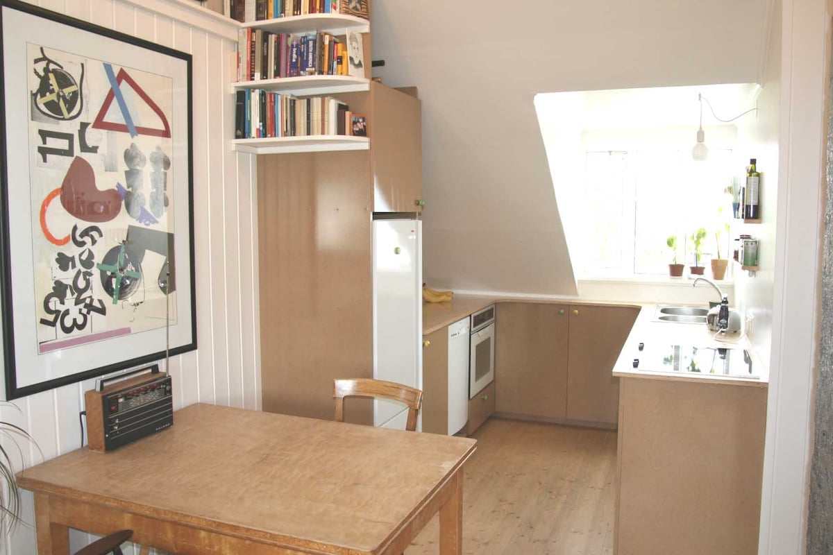 Lys og atmosfærisk leilighet i hjertet av Reykjavik sentrum. Bo i gangavstand til Reykjavik, museer, butikker, kafeer og summende liv, men likevel i en rolig gate i et karismatisk rekkehus i Reykjavik med hage. Liten, koselig takleilighet (øverste etasje i huset med tre leiligheter) med et varmt og minimalistisk interiør, en liten balkong mot hagen og et kjøkken med redskaper for å lage mat og et separat soverom. Badet med badekar er under taket (dusj under 170 cm) og sitteplass.