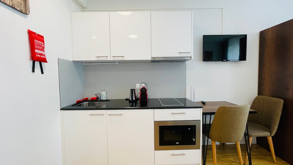 -180 cm king size-seng- Velkommen til våre moderne mikroleiligheter i hjertet av Kaiserslautern! Perfekt for unge fagfolk, studenter og pendlere, hver enhet er fullt utstyrt for dine daglige behov: en kaffestasjon med kjøleskap, mikrobølgeovn, Nespresso-maskin og vannkoker, en koselig seng, smart-TV og et privat bad med dusj. Nyt den sentrale beliggenheten, i nærheten av universitetet, butikker og kollektivtransport. Fellesområder som terrasse, vaskerom og lobby fullfører tilbudet.