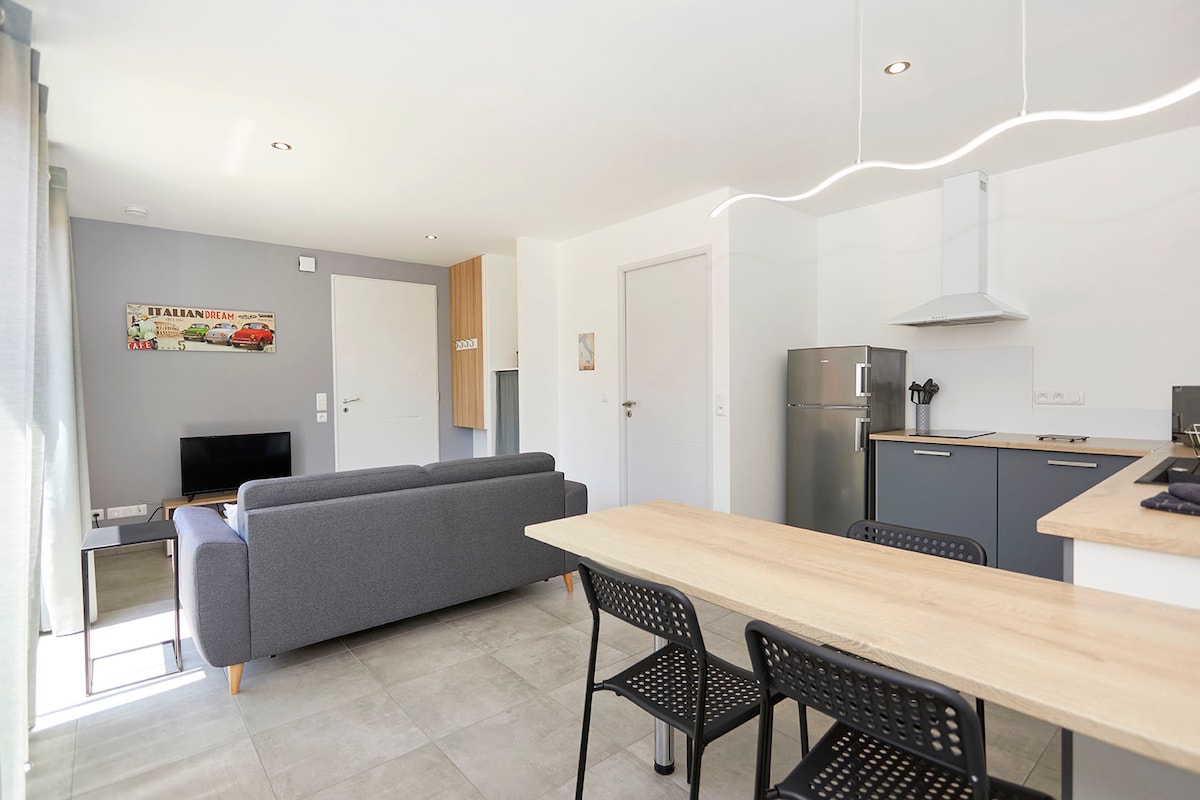 Perfekt for familier, overnatting i nybygd leilighetskompleks, bestående av to soverom, stue-kjøkken og bad. Ingen arkitektoniske barrierer, høye sanitæranlegg, automatisert seng i soverommet, hjemmeautomatisering med Google home (lys som slås på, persienner som lukkes, automatisk start av elektrisitet, musikk osv.). Kjøkken med induksjonsplater, kaffemaskin, vannkoker og mikrobølgeovn.