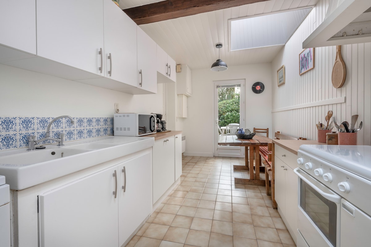 Frittstående hytte i en rolig blindvei, 1,5 km fra stranden Goh Vélin og 500 m fra sentrum og butikker, samt 3 km fra Morbihanbukten. I første etasje er det et kjøkken med spiseplass og stue, samt et toalett. I andre etasje er det 2 soverom, ett med dobbeltseng, og ett med enkeltseng. Badet har dusj, vask, toalett og oppbevaring. På baksiden er det en stor terrasse for å nyte livet ute. En barneseng er tilgjengelig.