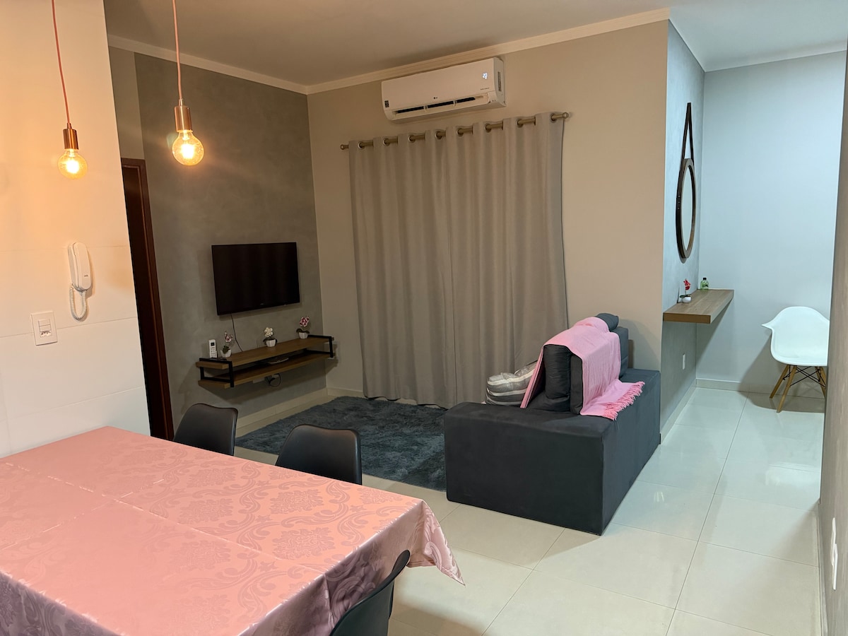 Nyt komforten i denne moderne og innredede leiligheten i Franca-SP. Den har 2 soverom, 1 bad, stue og soverom med smart-TV og utstyrt kjøkken. Tilgjengelig: TV-er, seng med dyne og beskyttelse, strykejern, mikrobølgeovn, kaffemaskin, luftfrityr, blender, gryter, fat, skåler, glass, alt nytt! Leiligheten tilbyr fullstendig fritid, med et treningsstudio og et leketøysbibliotek som er gratis å bruke, og en garasje. Enkel tilgang til Unifran, Avenida Champagnat. Utmerket beliggenhet. Fantastisk opphold, bestill nå