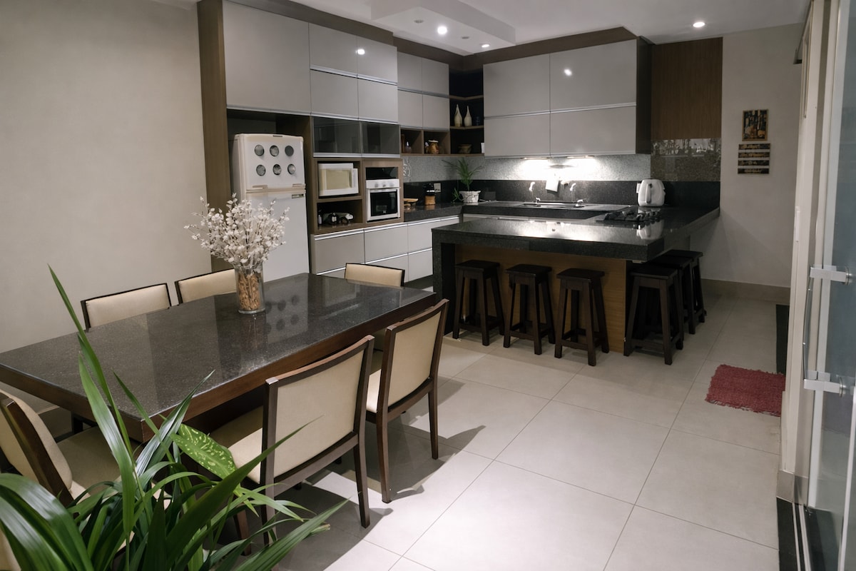 Møblert hus med fire soverom med klimaanlegg og et komplett fritidsområde med svømmebasseng og grill. Helt trygt og ideelt for familiesammenkomster og fester. Vi er i et av de edleste nabolagene i Ribeirão Preto, den botaniske hagen. Beliggenheten vår gir enkel tilgang for de som deltar på eksamen og arrangementer, 10 minutter fra Taiwan Event Center og 15 minutter fra golfstedet. Huset er i en region med enkel tilgang til markeder, kjøpesentre og restauranter.