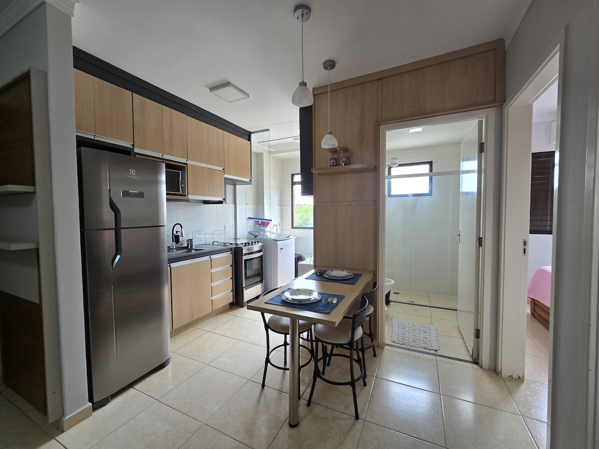 Apartamento novo com dois quartos, sendo uma suíte com cama de casal e um quarto com duas camas de solteiro, ambos com ar condicionado e roupas de cama de primeira qualidade, além de um sofá retrátil na sala. Espaço destinado a computador e notebook, wi fi de alta velocidade. Sala decorada e aconchegante com televisão Smartv, eletrodomésticos novíssimos, lava roupas dentro do apartamento. Varanda privativa espaçosa, com mesa grande para refeições.