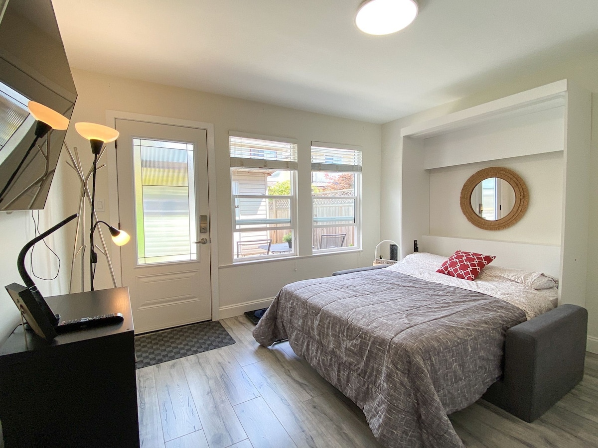 Slapp av i denne romslige studiosuiten. Komfortabel kingsize-seng med sengetøy av høy kvalitet. Regndusj og moderne inventar på badet. Hvil deg etter eller mellom fly, enkel Uber/Lyft eller transport fra flyplassen. Nyt Richmonds sykkelstier, Steveston Village og River-løyper. Starbucks, sushi, restauranter, dagligvarer 5 minutters gange. Gratis parkering. ***Klar for FIFA VM i fotball 2026! Enkel kollektivtransport til BC Place Stadium***