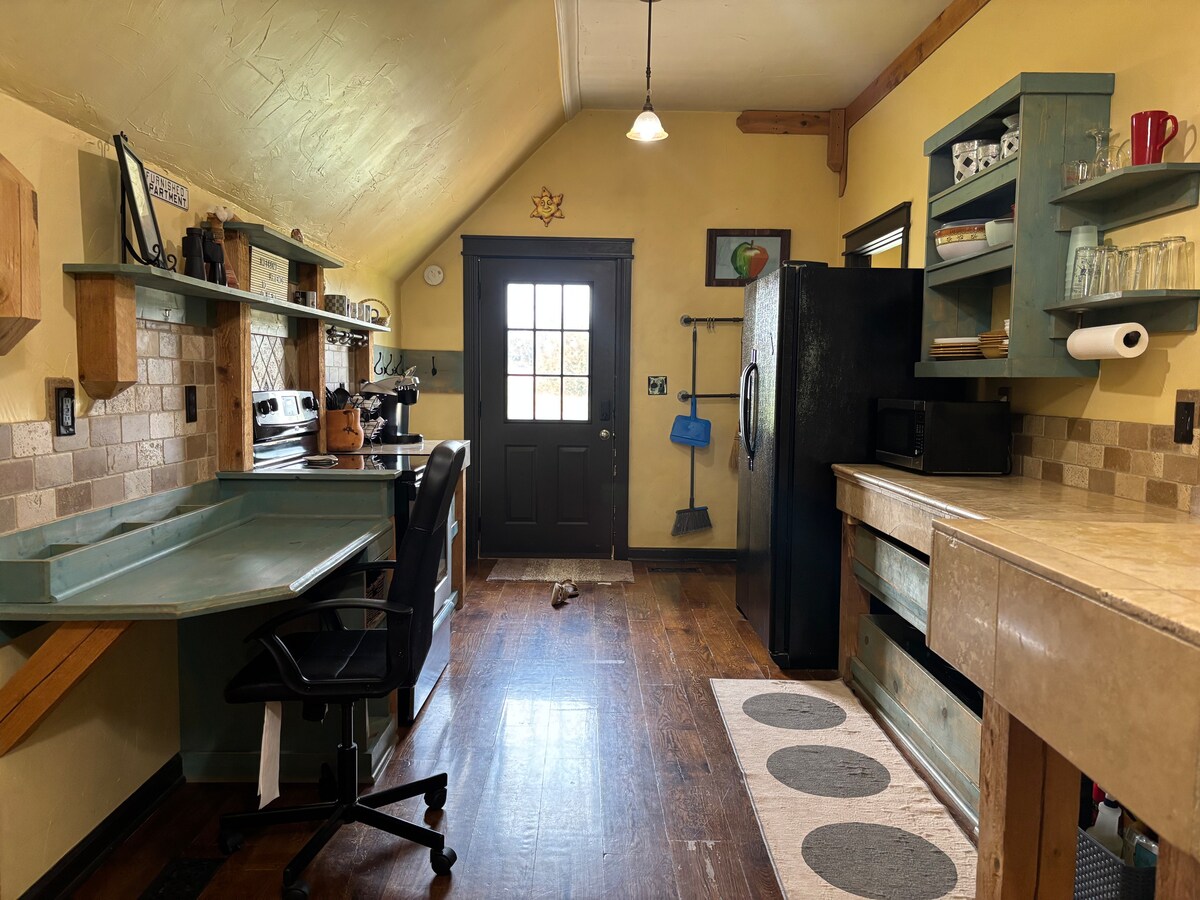 Velkommen til Louisburg! Romslig, privat inngang, 1000 kvadratmeter leilighet over frittstående garasje innenfor få minutter fra vingårder, antikviteter og Cider Mill. Beliggende på 15 mål, og 2 miles ned en grusvei, er du ute av byen og ser stjerner, med en fantastisk utsikt fra andre etasje. Plass til opptil seks personer med separat soverom med queen-seng og lavt tak (157 cm, flott for barn!), loft med to enkeltsenger og en dobbeltseng. Alt innpakket i unike finish, inkludert en fantastisk dusj! Ligger bare 45 minutter fra sentrum av Kansas City!