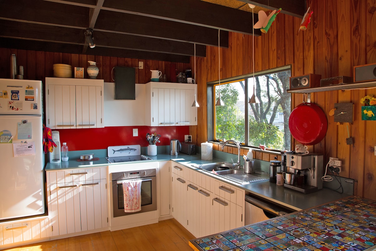 Det gamle, delt med det nye, en gammel forvitret skinnstol sammen med vakre moderne lamper. Vedfyringen, det er noe med en brann som varmer kroppen og sjelen din, en varmepumpe også. Vakre gulv i naturlig treverk. Kvalitetssengetøy, laken av 100 % økologisk bomull. Huset: på en halvøy, i nærheten av bryggen, ligger dette tilfluktsstedet i nærheten av restauranter, kaféer, gallerier, fisk og chips også. Sentralt til Abel Tasman nasjonalparks sykkelstier, vingårder, kunstgallerier.