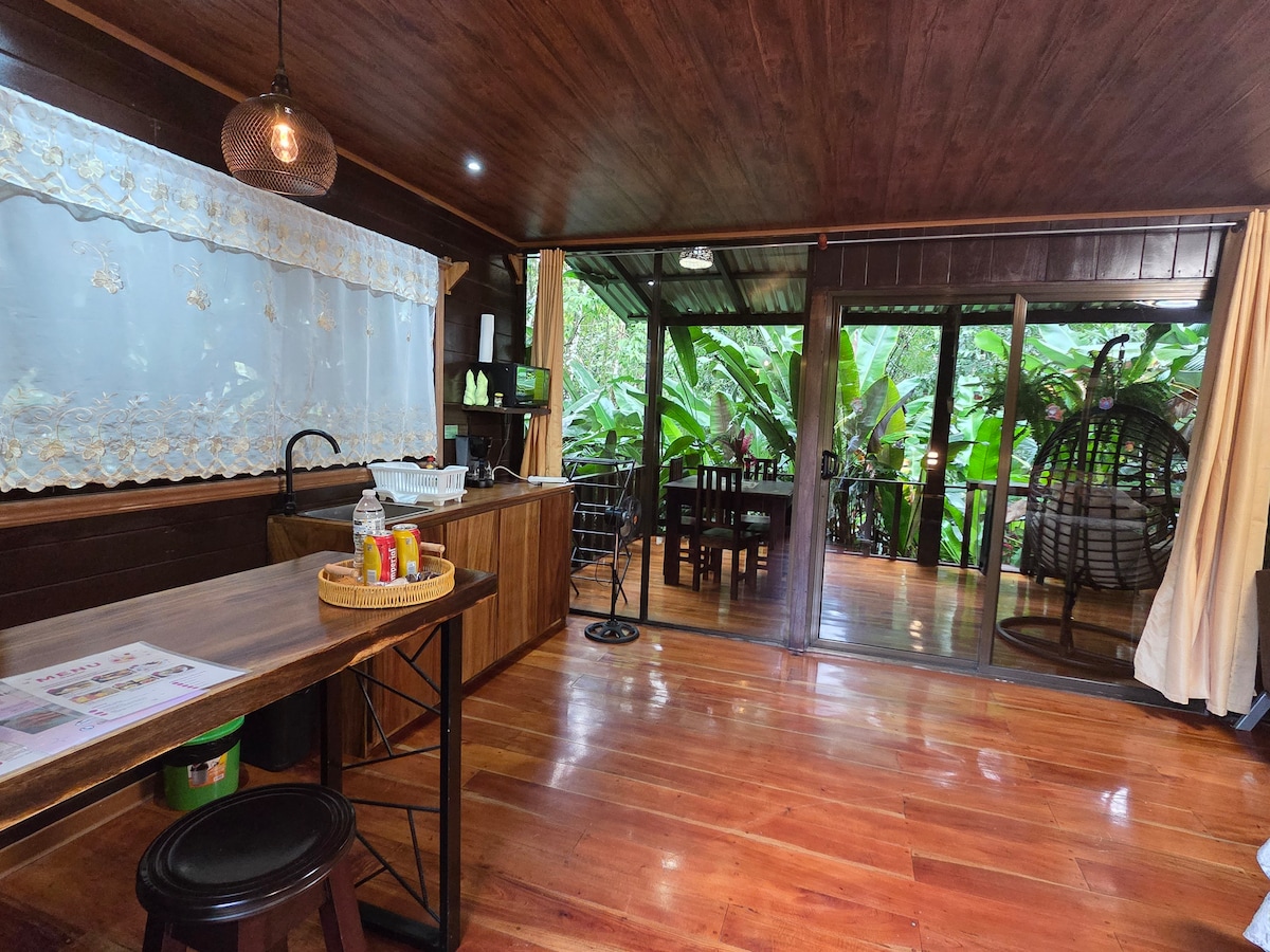 Privat hytte som ligger 3 minutter fra sentrum av La Fortuna, på en eiendom hvor du kan se dyr som kyr og påfugler. Utmerket og komfortabel, beliggende i et trygt område, med privat parkering. Slapp av i dette rolige rommet, ved siden av lyden av elven og omgitt av natur og eleganse. Kom og nyt en unik og autentisk opplevelse med partneren din og familien din, med service av høy kvalitet og komfortabel og romslig innkvartering.