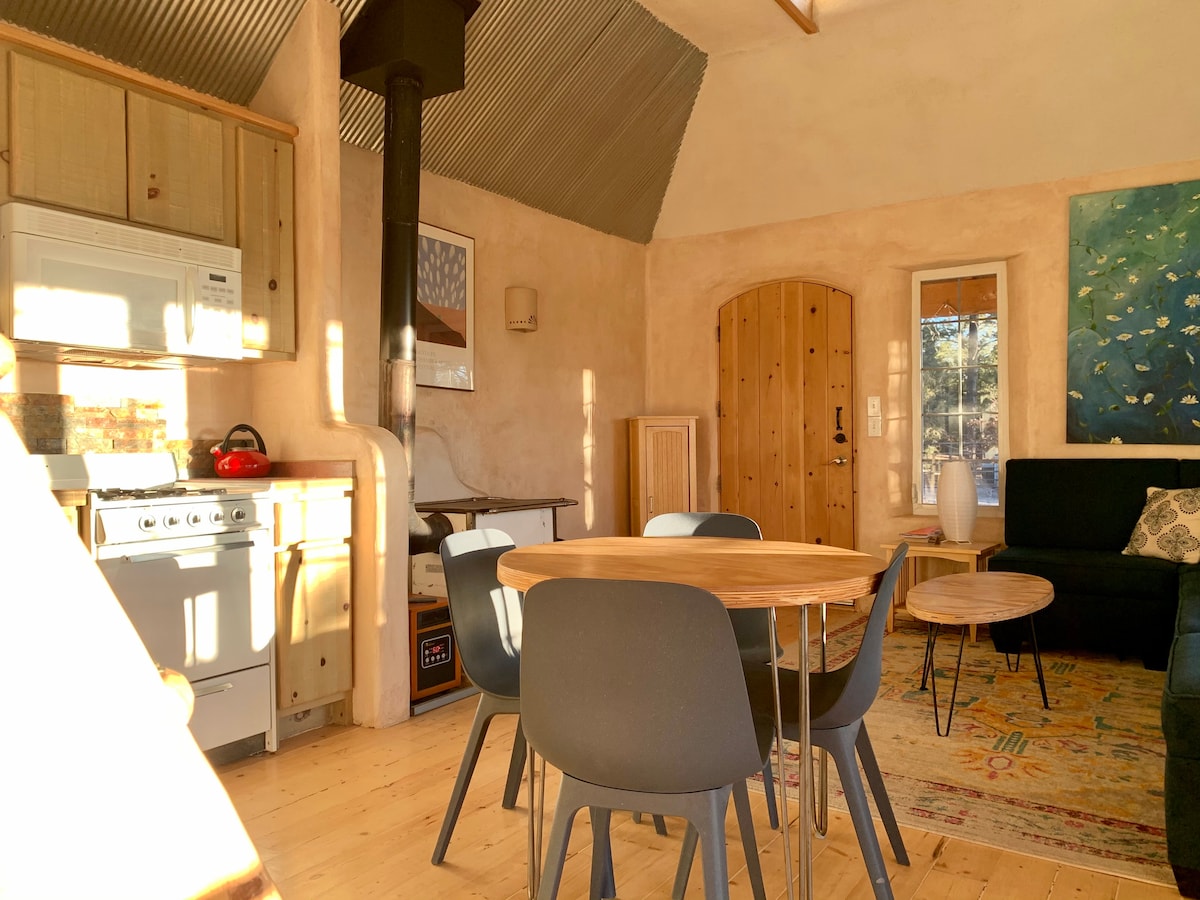 Vårt moderne jordhus er et koselig, håndverksbygd rede som gir gjestene lys, åpen plass og farge. Det har en rolig, privat setting med alt som trengs for å gjøre oppholdet ditt komfortabelt og forhåpentligvis inspirert. Utendørs er denne boligens andre halvdel, og skaper et omsluttende amfiteater av hager, fugler, trær og en hengekøye. Utover dette private reiret er det 360 graders utsikt over Sangre de Christo-fjellene, Rio Grande-juvet, spektakulære solnedganger og milesvis av tur- og sykkelstier.