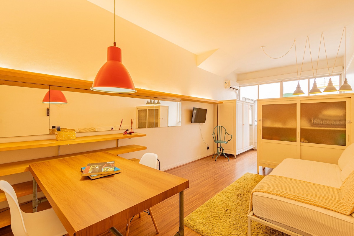 Boho chic stil leilighet, på Copacabana-stranden! - queensize-seng, sovesofa, spisebord, klimaanlegg og plass til hjemmekontor (trådløst nettverk 300 Mbps). Kjøkken med komfyr, kjøleskap, stekeovn, mikrobølgeovn, blender, kaffetrakter, juicemaskin, sandwichmaskin, panner, kjøkkenredskaper, forskjellige bøker, gitar og TV med apper. - Marked og apotek under bygningen, restauranter og butikker rundt leiligheten. - flyplass på 8,3 km - Cristo Redentor på 11,5 km - Pão de Açúcar på 2,8 km