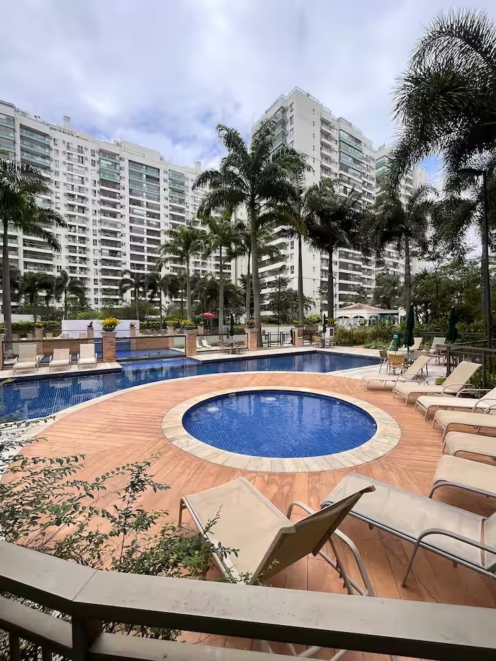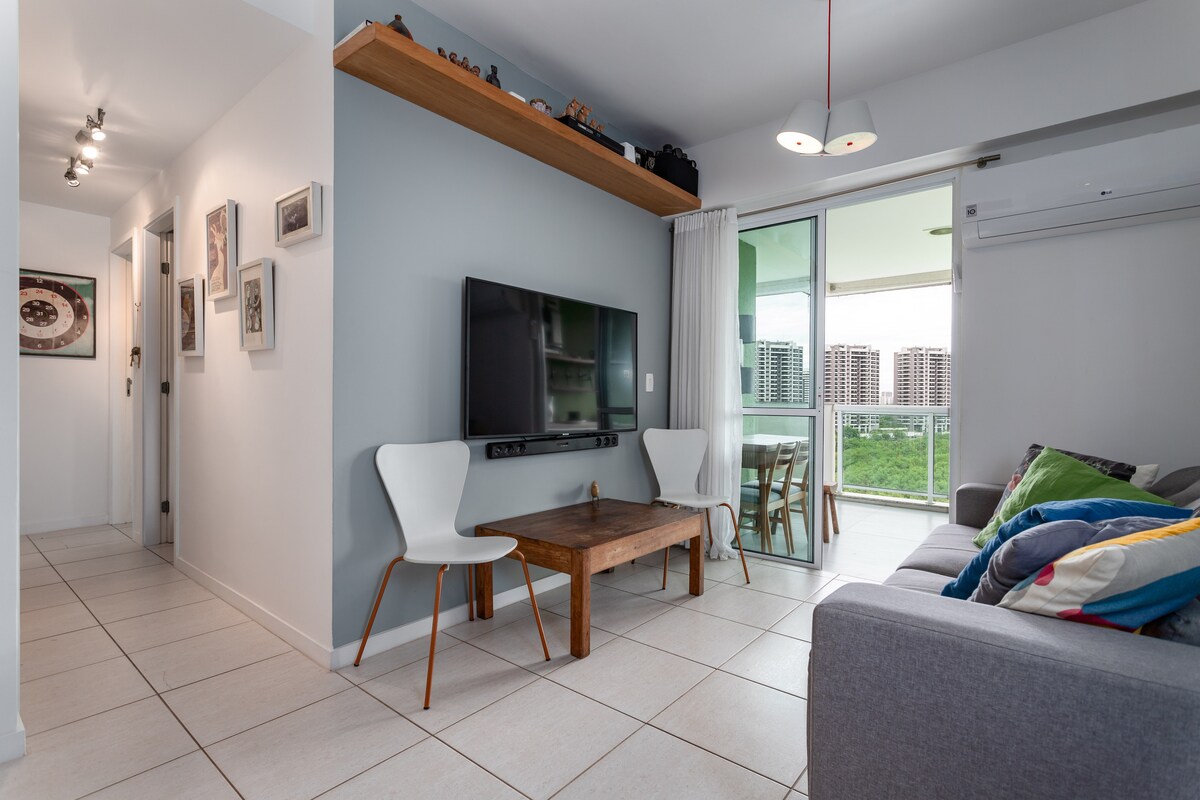Apartamento limpo, a 1km de distância do Rio Centro, e a 4 do Farmasi Arena e a 7km da praia em perfeitas condições para vc e sua família Possui extensa área verde e muito lazer, quadras esportivas, piscina, salão de jogos, pet place para seu caozinho. O apartamento possui TV a Cabo , internet com 500mega vivo fibra, máquina de lavar e 2ar condicionado, para maior comodidade tem um mercadinho no condomínio, a janela e porta da varanda possuem trava para maior segurança das crianças