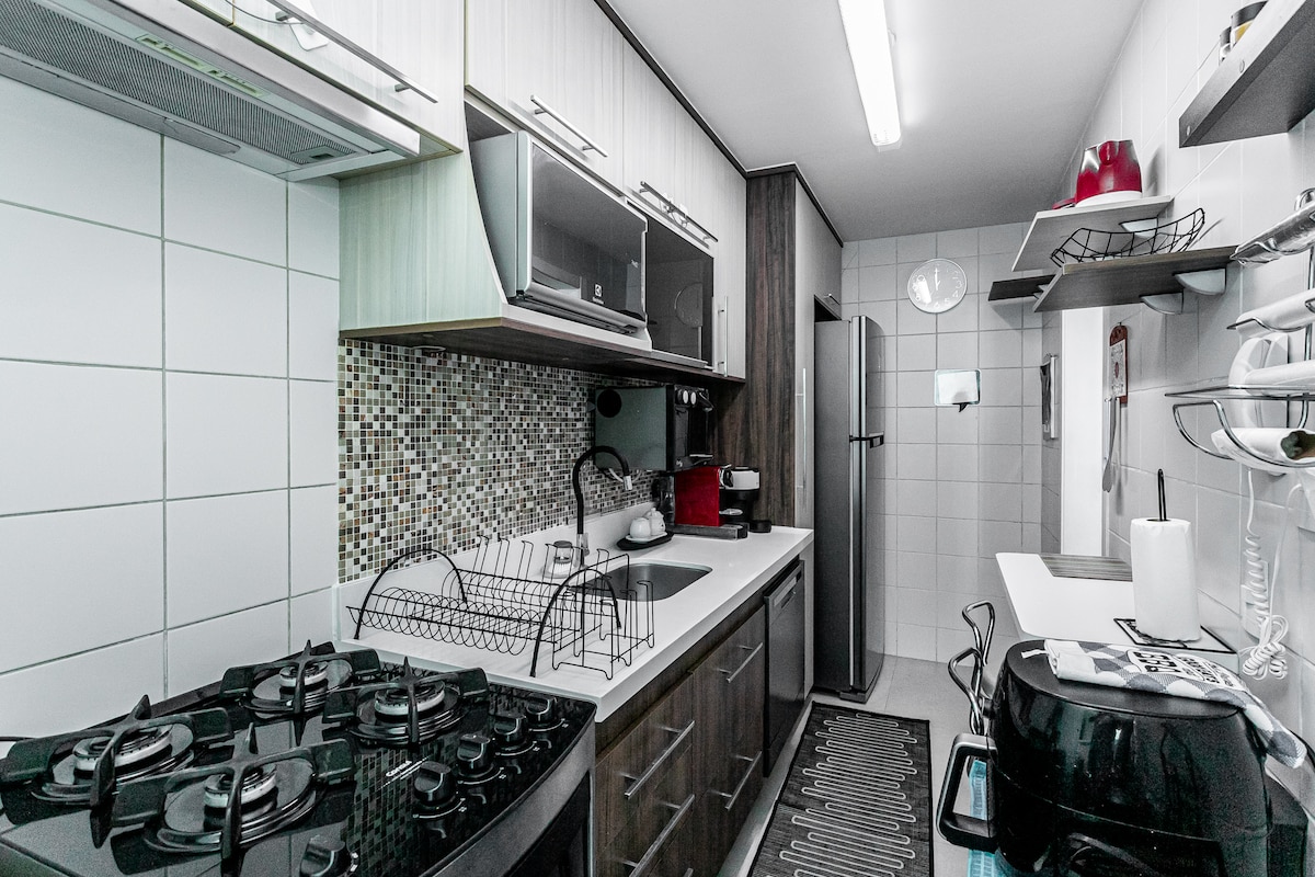 Sjarmerende og komfortabel leilighet, ideell for familier eller venner. Det er to soverom (queen suite + dobbelt) og en stue med sovesofa, alle med aircondition, smart-TV og en stor, lys balkong. Fullt kjøkken med vaskemaskin og tørketrommel, dupleks kjøleskap, luftfrityr, kaffemaskiner (elektrisk og Nespresso). Raskt trådløst nettverk og hårføner tilgjengelig. Beliggenheten er strategisk: bare fem minutter fra Farmasi Arena, Parque Olímpico, RioCentro og Projac, og ti minutter fra strendene Recreio, Reserva og Barra da Tijuca.