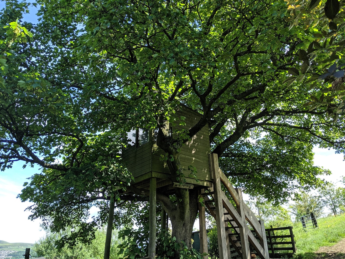 Et tretopphus med selvhushold med dobbeltseng i sovesofa og fantastisk utsikt over vår gård i åsene og nærområdet. Slapp av i hengekøyen under treet, slapp av ved siden av branngropen eller kos deg i sengen under dynen. Privat boblebad tilgjengelig for leie mot et tilleggsgebyr (£ 42). Ta en titt på gårdens nettsted for tilgjengelighet og andre tilbudte aktiviteter. Nysgjerrig på gården vår på Insta @cronkshawfold.