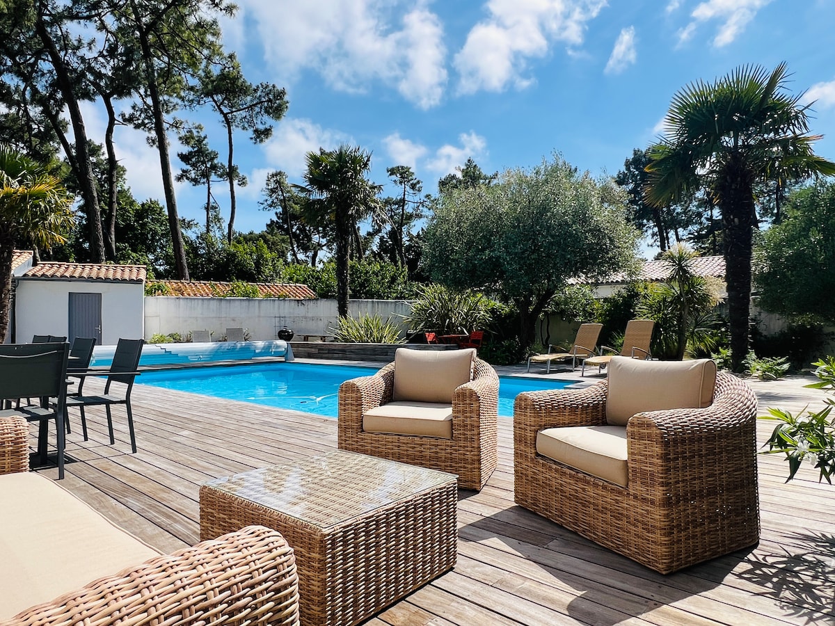 Villas Véronique, et stykke paradis på Ile de Ré Et unikt sted for en ny tilnærming til luksus. Vakker villa med privat oppvarmet basseng 50 meter fra havet. Stuen er åpen mot utsiden. Et soverom med dobbeltseng og sengetøy av høy kvalitet kobles til stuen gjennom en stor, utskåret dør i rosentre. Det andre soverommet har enkeltseng. Badet har en walk-in-dusj i naturstein.