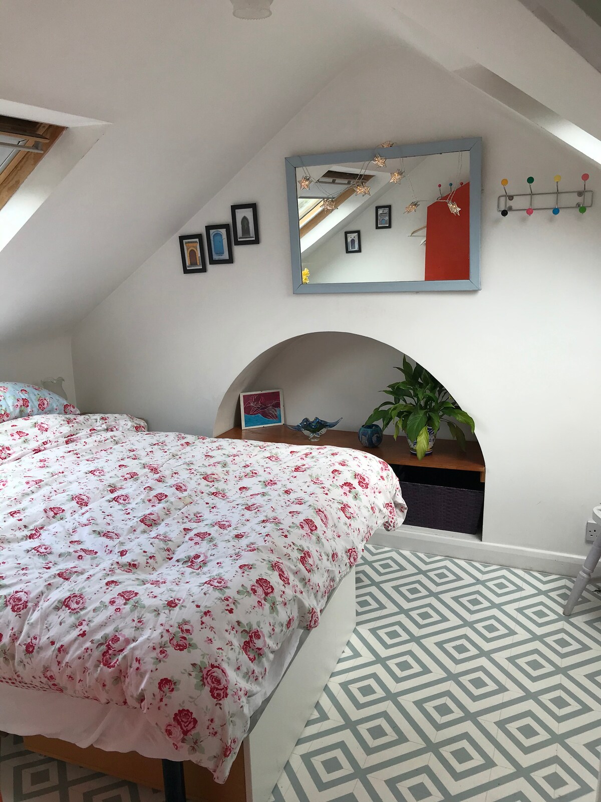 Det er to små rom øverst i huset, ett med dobbeltseng og det andre med enkeltseng. Begge rommene har vinduer foran og bak som er fulle av lys og noen ganger til og med sol! Det enkle rommet kan brukes til en gjest eller som stue og plass til å legge igjen bagasje. Her setter jeg igjen en vannkoker med te og kaffe. Den plantefylte avsatsen som forbinder rommene har trapper ned til resten av huset og badet kun for gjester.