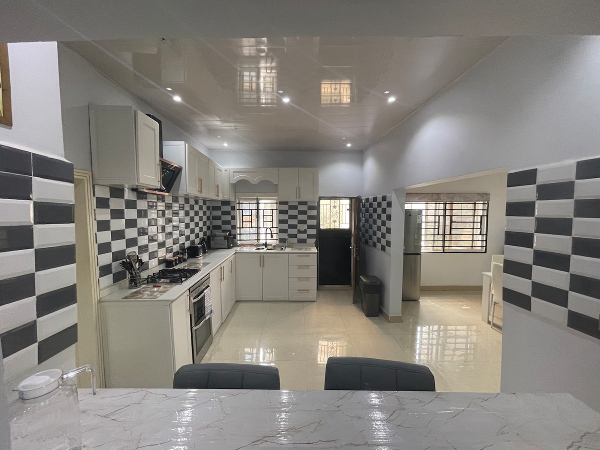 Forget your worries in this spacious and serene space. Tastefully decorated and fully furnished modern 3 bed house with scenic mountains views Perfect for: Remote workers, expats, travelers, and business visitors. Wi-Fi Guest Toilet AC Utensils Solar power Spacious parking Security guard CCTV Electricity Please note that Havillah Court is located on top of a hill but is accessible via a paved road from the main highway. You need a good car that can climb hills.