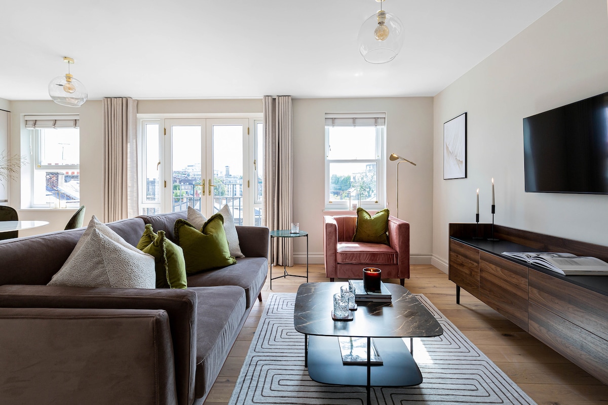 Start dagen med en kopp te på den solfylte takterrassen før du går tilbake til et skinnende hvitt kjøkken for å lage frokost. En komfortabel sofa tilbyr et herlig sted å lese en bok i denne friske leiligheten i en sjarmerende georgiansk bygning. Denne nyoppussede toppleiligheten ligger sentralt, kun noen minutter fra Fulham Broadway Tube, noe som gir deg allsidig tilgang til hele sentrum av London. Et lyst og luftig oppholdsrom med et helt nytt kjøkken med konveksjonstopp, stekeovn, kjøleskap, mikrobølgeovn og en Nespresso-kaffemaskin. Det åpne kjøkkenet/stuen har en skreddersydd benk med sitteplass. Resepsjonen har USB-porter for lading av telefonen din (ta med telefonkabelen din) og en nyinstallert TV med Netflix. Stuen åpner seg mot en sørvestvendt terrasse med utsikt over modne trær som fører til parken. Et perfekt sted å nyte en morgenkaffe eller en tidlig kveldsdrink, slik at du kan nyte den summende atmosfæren. Gratis trådløst nettverk er tilgjengelig. Soveromssuiten har skreddersydde garderobeskap med kleshengere og et helt nytt dusjrom med regndusj og belysning. Vi leverer ett sett med rent sengetøy for oppholdet ditt, Nespresso-kaffe, te, melk, søtsaker og en skreddersydd håndbok for å veilede deg til lokale restauranter og nødvendigheter. Enten oppholdet ditt i London er i forbindelse med en jobbreise, tur, shopping eller bare fornøyelse, er dette en ideell sentral beliggenhet i London. På baksiden av bygningen er det tilgang til kaffebarer/restauranter og en herlig park, med Boris Bikes tilgjengelig for leie hvis du har lyst til å ta en tur. 07703004354 – Jeg er tilgjengelig døgnet rundt! Det er en bussholdeplass rett utenfor leiligheten med ruter som tilbyr korte turer til populære attraksjoner i London. Harwood Road Apartments har en ideell beliggenhet i nærheten av Fulham Broadway, noe som gir deg tilgang til hele sentrum av London via undergrunnsnettet og flere busstjenester. Området har en livlig stemning og en stor samling restauranter og butikker som tilbyr et bredt spekter av mat fra fransk (Cote Brasserie) til thai (£ 9,95 for en toretters lunsj overfor leilighetene) til Byron Burger til en Oyster Bar. Det er et treningsstudio, kino og en vakker park (med tennisbaner) innenfor et steinkast!