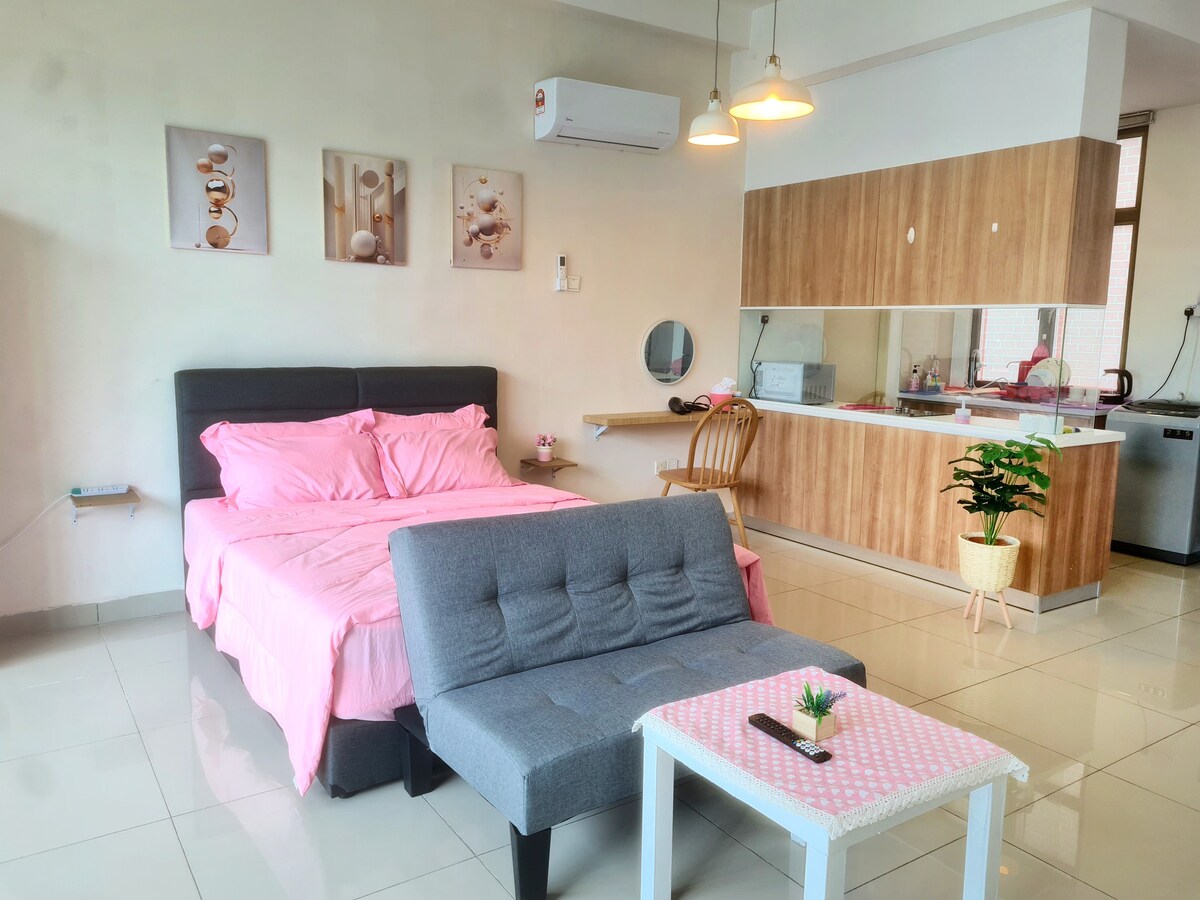 Twin Galaxy Residence! Velkommen til vår romslige/grønne og koselige studioenhet med fantastisk utsikt over byen❤️, perfekt for par, små familier, forretningsreisende/turister for 2/3 personer. Enheten vår ligger i hjertet av Johor Bahru, stedet er omgitt av en rekke restauranter, familie spa/massasjesenter, praktisk butikk, natteliv og så videre. Kom og nyt ^^ Huset er møblert med én queensize-seng, en sofa (også en sovesofa), dedikert arbeidsplass og kjøkken med daglige nødvendigheter :)