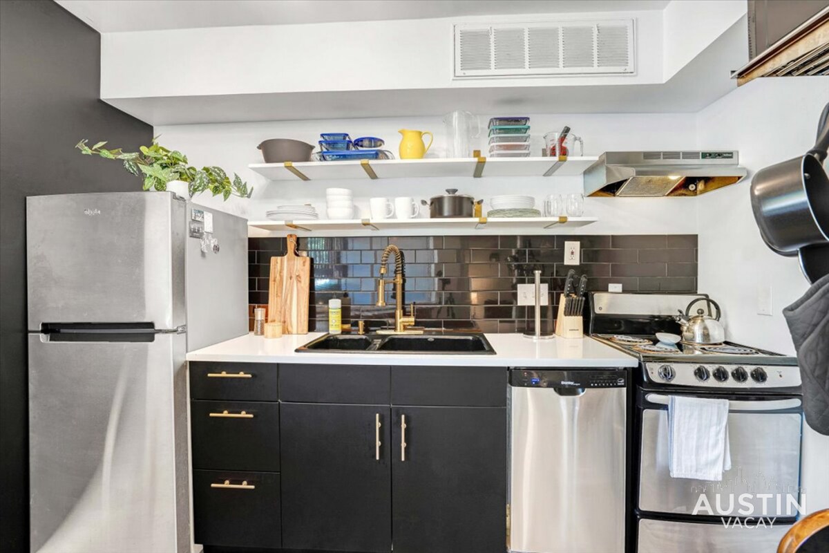 Velkommen til ditt andre hjem i denne moderne 2/2! Enten du reiser for å utforske Austin eller for å bosette deg på en jobbreise, har vi det du trenger. Vi tilbyr pålitelig trådløst nettverk og plass hvis du trenger å jobbe. Med beliggenhet i et rolig nabolag i Øst-Austin, er du bare noen minutter unna alt som skjer. Sentrum, Lady Bird Lake, Rainey, East/West 6th St., Zilker Park og SoCo ligger alle innenfor rekkevidde. Nyt alle fasilitetene du forventer deg hjemmefra, med en romslig terrasse og et bålsted.
