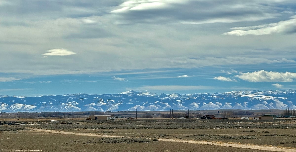 Komfortabelt, rolig hjem med to soverom, praktisk plassert utenfor HWY 287, i bomullsmarkene, med en inspirerende utsikt over Wind River-fjellkjeden. Denne nylig oppussede, unike og rolige eiendommen har: trådløst nettverk, premium queen-senger, fullt kjøkken, dusj, vaskemaskin/tørketrommel og vaskerifasiliteter, peis, arbeidsplass, tilkobling for bobiler/elbiler, rikelig med sitte-/spiseplass, og er barne-/kjæledyrsvennlig. Det er en perfekt ferie for å besøke, stoppe over eller se verden gå forbi.