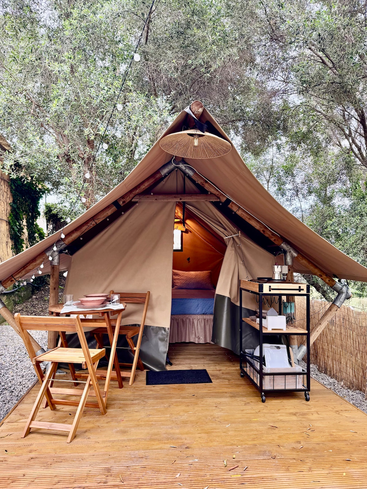 Volete provare l'emozione del campeggio senza rinunciare alla comodità di un vero letto? La nostra Tenda per due è un nido romantico immerso in un uliveto secolare all'interno del Camper Village. Perfetta per coppie che cercano silenzio, natura e un pizzico di avventura.