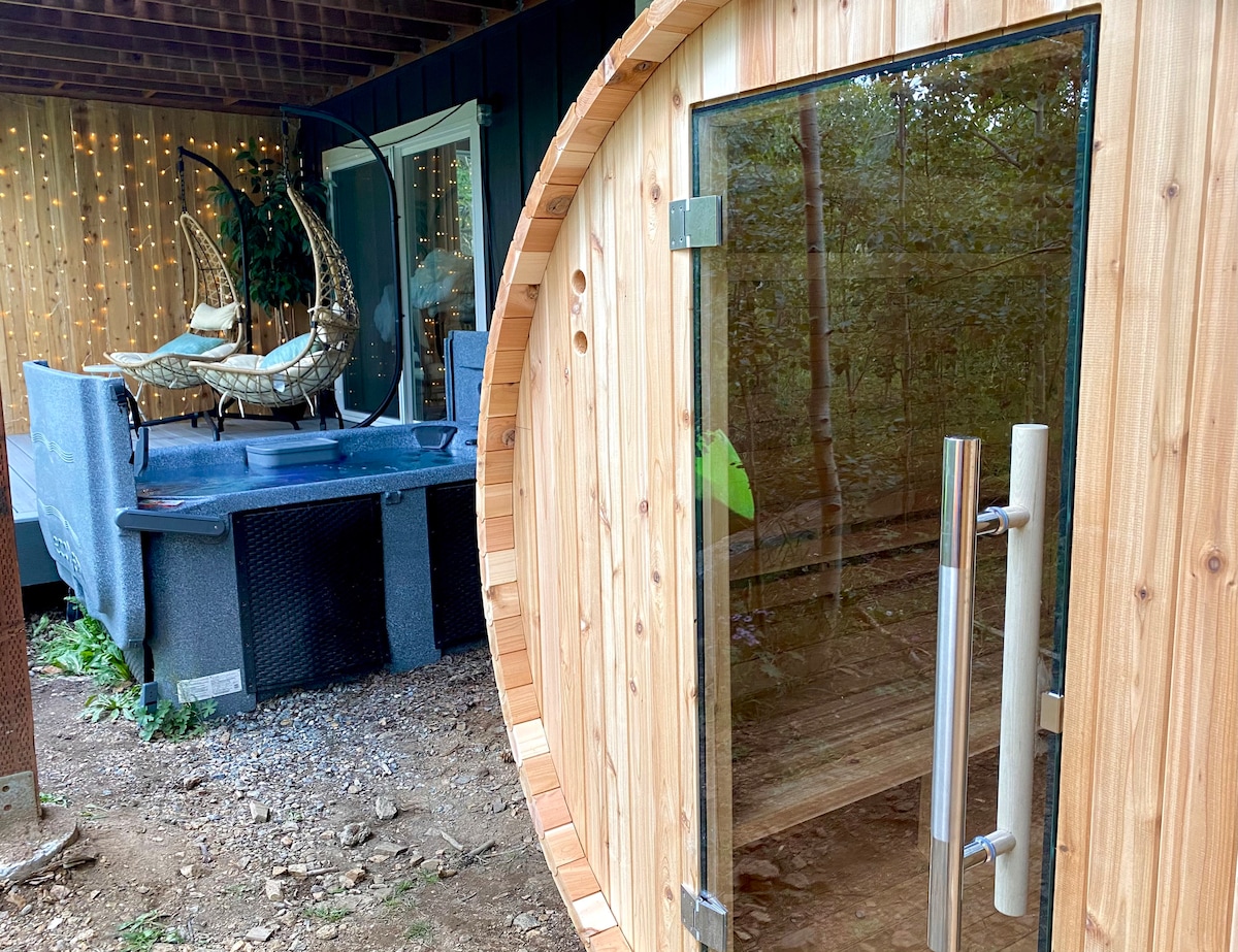 Luksuriøs A-ramme spa, boblebad, tønnebadstue