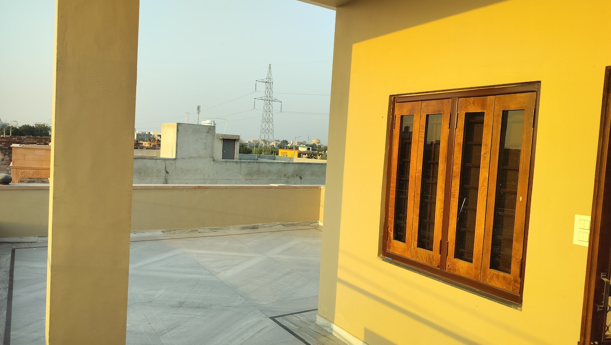 Forget your worries in this spacious and serene space. Experience comfort and serenity at Pushp-Raj, located just 11 km from the railway station and 14 km from the airport. Major attractions lie within 10–15 km. The property offers 3 spacious AC rooms with king-size beds, attached washrooms, and changing rooms. Enjoy a 55" TV with soundbar, Wi-Fi, dining area, mandir, kitchen, common terrace, and free parking. Ideal for families, corporates, and foreign guests seeking a calm, luxurious stay.