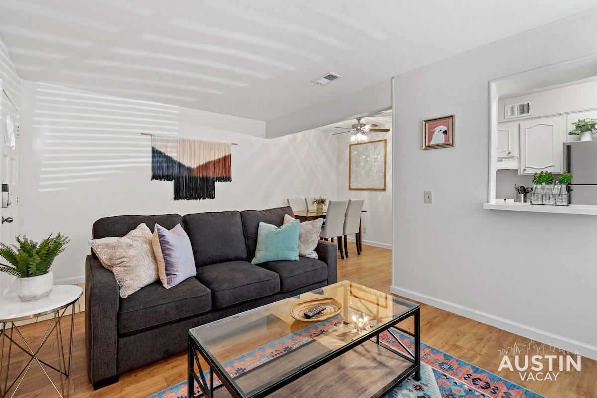Du har egen inngang til soverommet og badet i dette rolige nabolaget som er lett å gå rundt i. Vi er et steinkast unna en rask buss til Zilker Park eller sentrum. Våkn opp og nyt kaffen på verandaen, eller gå rundt hjørnet til et av Austins favorittfrokoststeder. Etter en dag med utforsking, kan du komme tilbake for å slappe av og hente takeaway nede i gaten fra en lokal restaurant eller matvogn.