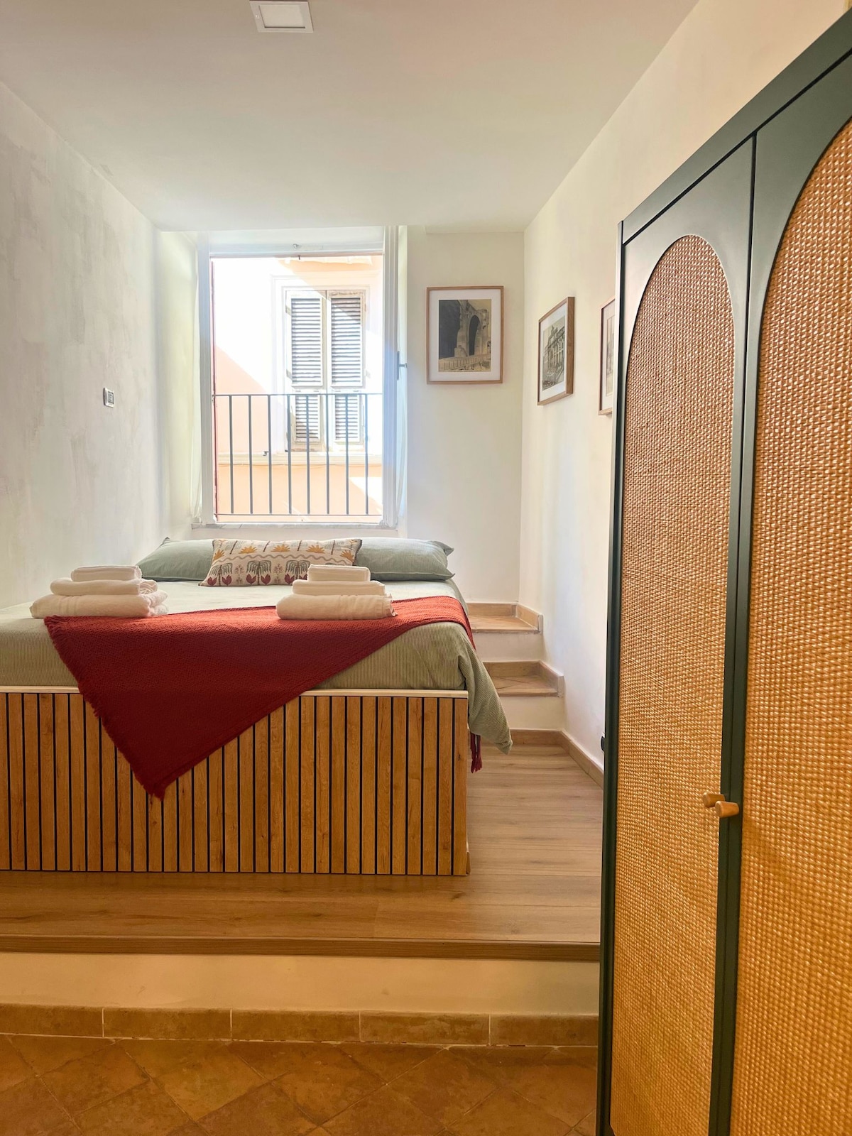 Hele leiligheten ligger i femte og øverste etasje i et gammelt palass fra 1700-tallet, et steinkast fra Colosseum. Komfortabel og lys, fra vinduet kan du beundre de keiserlige forene. Den totalrenoverte leiligheten består av: stor stue med kjøkkenkrok (utstyrt med alt nødvendig servise, induksjonstopp, mikrobølgeovn, vaskemaskin) spisebord, dobbelt soverom og bad. Området er veldig karakteristisk og godt betjent (bar, marked, klubber)