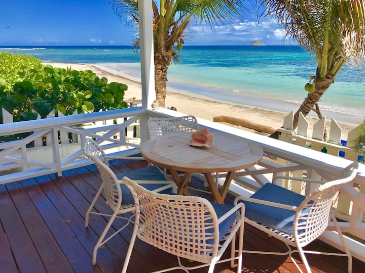 Rett på den karibiske stranden! Fredelige bølger.