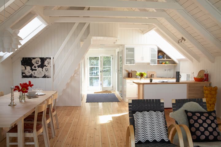 Vi fant dette stedet for mange år siden og har bodd her siden det. Det har tatt lang tid å sette husene i stand, opparbeide hagen og holde stedet ved like. Det har blitt en livsstil. Vi bor i ett av husene, og leier ut tre hus både på landtids- og korttids kontrakter