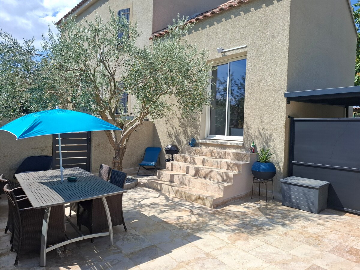 Mas har en svært rolig leilighet med klimaanlegg, to-roms midt i vingårdene, ikke oversett. Fem minutter fra motorveien A9, denne uavhengige leiligheten med to/3 rom med utstyrt kjøkken, stor dobbeltseng (140 cm) og 2-seters sovesofa (160 cm) med madrass (19 cm). Hvis det er bestilt for 5 personer, åpner vi et ekstra sammenhengende rom med én seng for én person på 120 cm. Dette tredje rommet kan også bestilles for tre eller fire personer ved å angi en reservasjon for 5 personer.