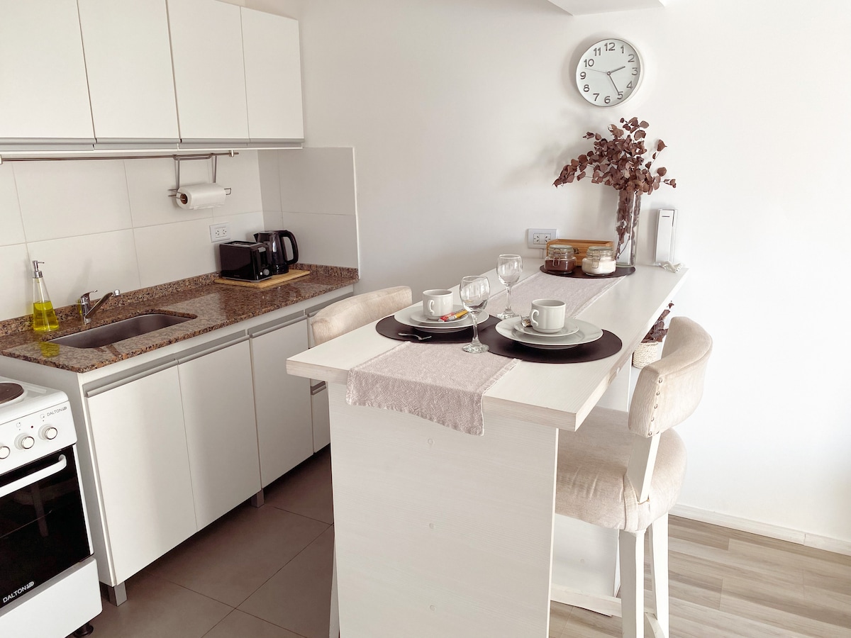 Ny og lys ettromsleilighet med stor balkong på forsiden 🌇 • Ditt sted i Rosario Utmerket miljø og beliggenhet. Utstyrt med klimaanlegg med varm/kald luft, mørkleggingsgardiner, fibernett, fullt utstyrt kjøkken og alt du trenger for oppholdet ditt. Vi vil at du skal føle deg hjemme og kunne oppleve Rosario i ditt eget tempo🙌 Vi klargjør dette stedet slik at du kan nyte den elskede byen vår. Vi venter på deg! Gratis parkering er tilgjengelig i nærheten. Vi har ikke garasje.