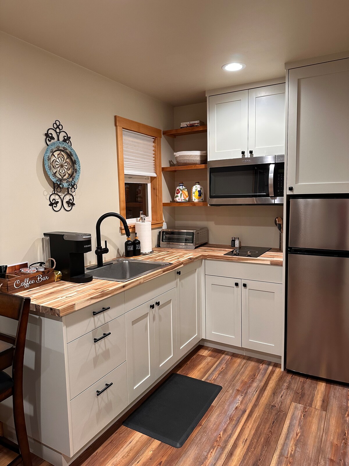 Vakkert innredet leilighet med alle fasiliteter, med utsikt over hjertet av sjarmerende Eastsound Village. Alle bekvemmeligheter tilbys: fint sengetøy, smakfull innredning, fullt utstyrt kjøkkenkrok, lokalt brent kaffe, flatskjerm-TV og koselig propanovn. Nyt en spasertur ned stranden og gå til alle bekvemmeligheter. OPPDATERING MARS 2020: På grunn av bekymringer for koronaviruset tilbyr vi full refusjon hvis du må kansellere. Og du kan være trygg på at vi desinfiserer GRUNDIG mellom gjester.