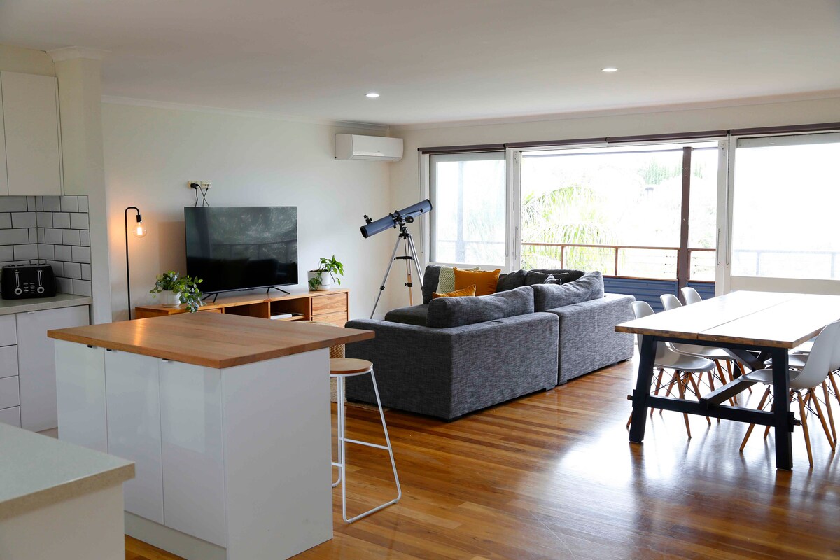 Bring your lovers, family, friends, pets and toys to experience all the Peninsula has to offer while staying in our architecturally designed Eco Retreat. Our huge outdoor entertaining area/kitchen has a long table for leisurely lunches, bbq, fire pit and hammock hangs. The house is open and bright, with plenty of couches and beds, a pool table, dress up box, disco ball, eclectic art, books, games, herb garden, hot outdoor shower and a composting toilet! Come and play…