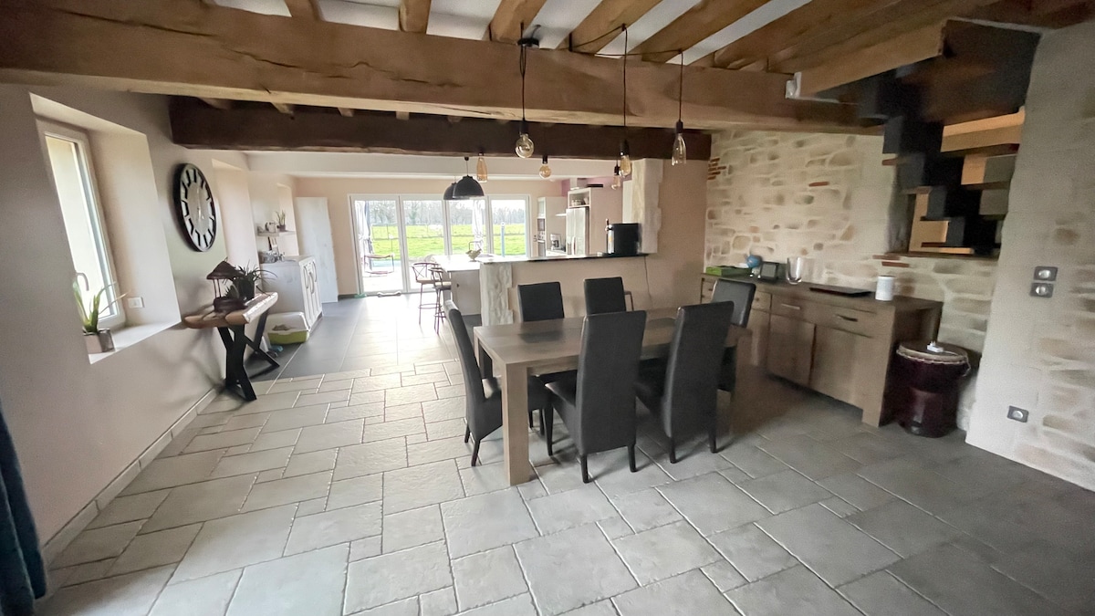 Gårdshus i ett plan, rolig, uten naboer rett overfor, nær landsbyen og 10 minutter fra 24-timersbanen. Huset består av en inngang med garderobeskap, en stue med storskjerm-TV og box, et kjøkken, 4 soverom, 1 bad, 1 dusjrom med toalett og et separat toalett. Et klimatisert spillrom med fotball, dart, bordtennis, arkadespill og utespill. Et bassengområde (4 * 8) og spa (5 personer) åpent fra 9 til 21 med liggestoler