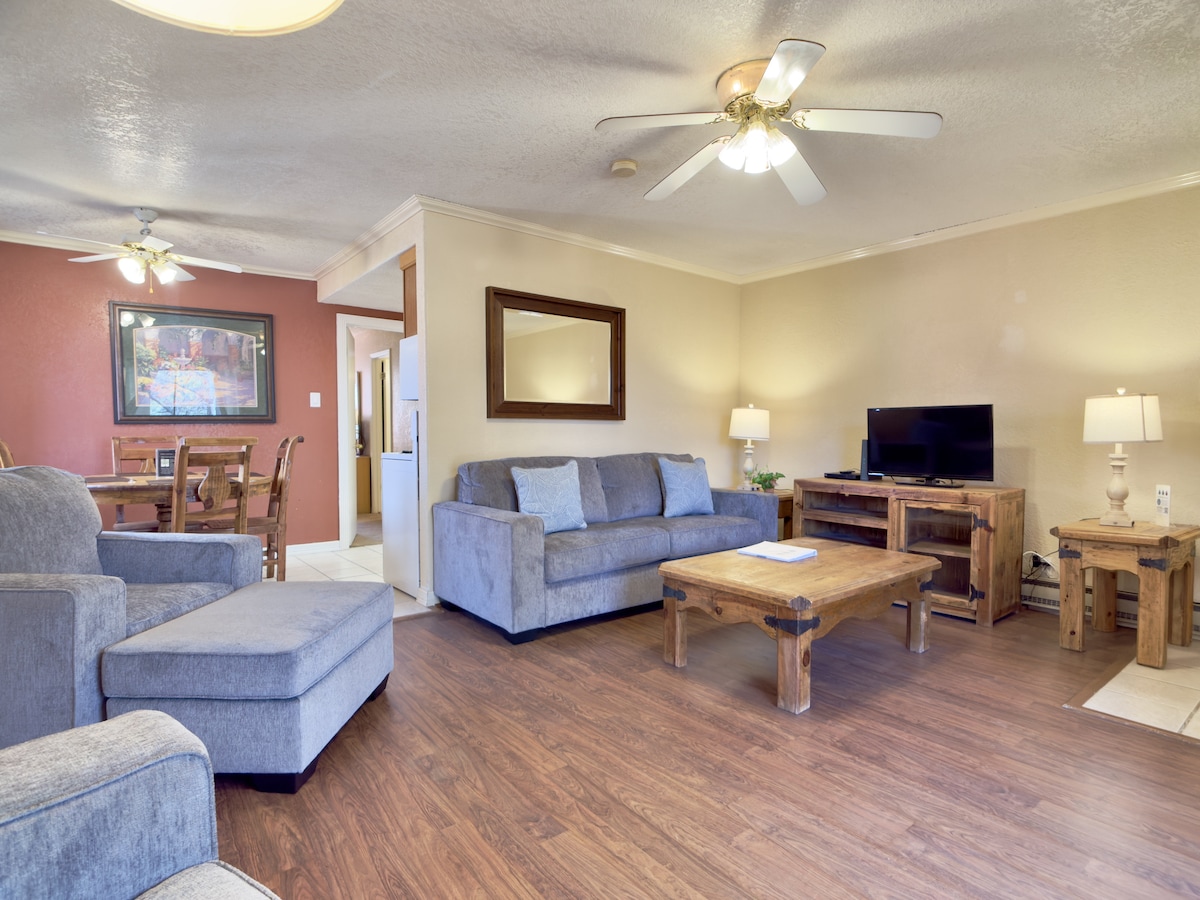 Våkne til de fredelige furutrærne og den friske fjelluften i denne sjarmerende leiligheten med to soverom og to bad, som ligger perfekt til for en avslappende ferie i Ruidoso. Stedet er utformet med tanke på komfort og enkelhet, og det har plass til opptil fire gjester og alt du trenger for et stressfritt opphold – enten du er her for å oppleve friluftsliv eller for å nyte litt ro og avslapning. Alle fasiliteter er inkludert! 9-hulls golfbane med par 3, pickleball, sesongbasert basseng, ørretfiske og mer!