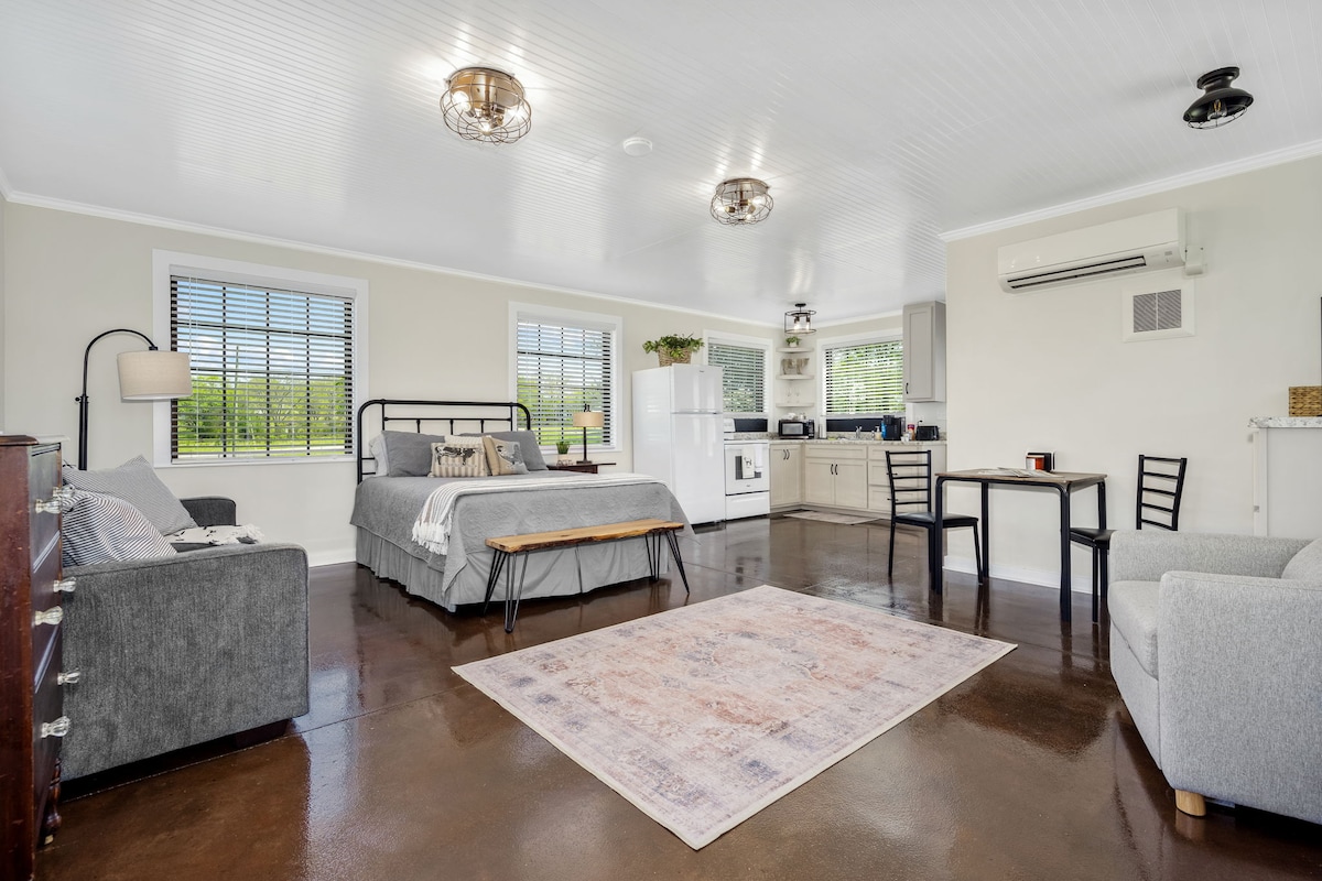 The Rustic Guesthouse har privat inngang og romslig gjestehus i studio-stil. Komplett kjøkken m/ bar for spisestue eller et skrivebordsområde. Privat bad med dusj. Soveromsområdet har en komfortabel queensize-seng. Koselig stue med sofa og smart-TV klar for strømmetjenester (ingen kabel-TV). Vi er på 4,5 + hektar omtrent 8 minutter til MTSU, 15 minutter til St. Thomas og et par gårder unna Hop Springs Beer Park. Vi er på landet og bare 8 km til Walmart og restauranter. I24 er ca. 15 km unna.