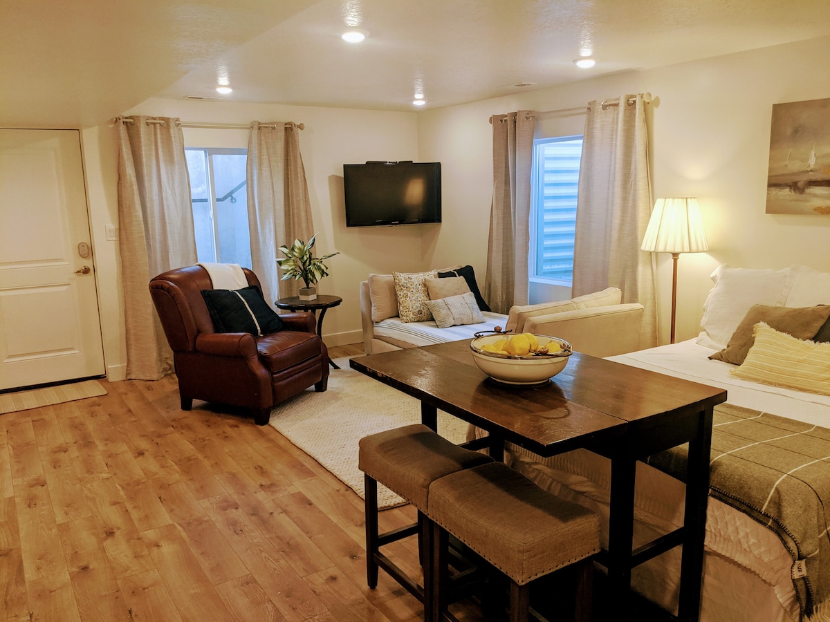 Å være hjemmefra kan være UBEHAGELIG! Men det trenger ikke å være det. Denne bedårende kjellerleiligheten er perfekt enten du besøker familie, jobber hjemmefra eller trenger en natt borte. Du får følelsen av et boutiquehotell med privatlivet i et rolig nabolag og alle hjemmets bekvemmeligheter (parkering uten den vanskelige bakgårdsinngangen, fullt kjøkken og vaskeri, Zoom-vennlige arbeidsområder osv.). I TILLEGG er du sentralt plassert for både Utah og Salt Lake fylker og bare minutter fra fjellene!