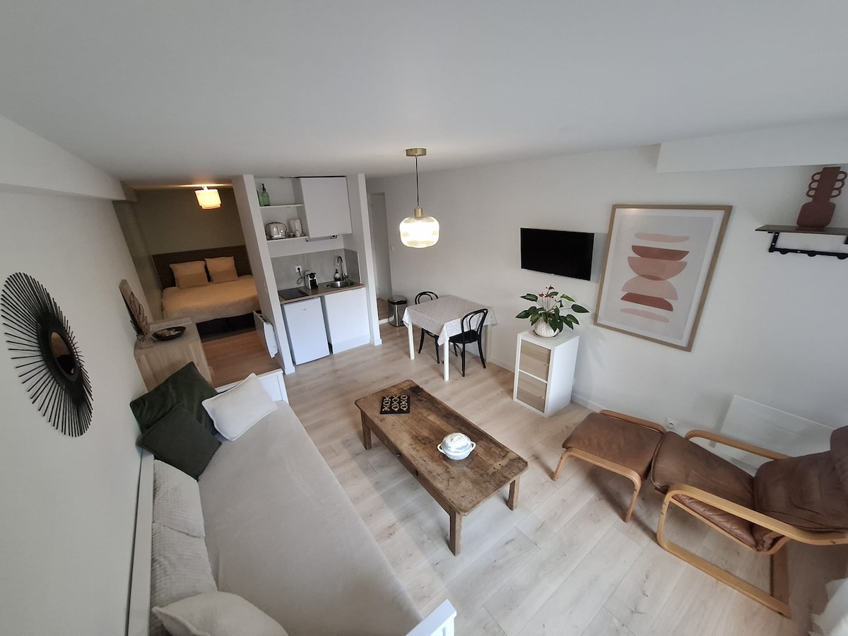 Studio de 19m2 se composant d'un espace nuit avec un lit confortable et une TV ,d'un espace repas avec un micro-ondes,d'une bouilloire,de la vaisselle ,un frigo,puis une douche à l'italienne ,wc.unventilateur. Parking gratuit devant la Résidence,Il n y a pas de fenêtre...une seule dans la salle de bain....mais une porte vitree que vous pouvez laisser ouverte l 'ete car elle donne sur le jardin. Draps,torchons et serviettes non fournis.Pas de plaque de cuisson mais un micro ondes.Pas de wifi
