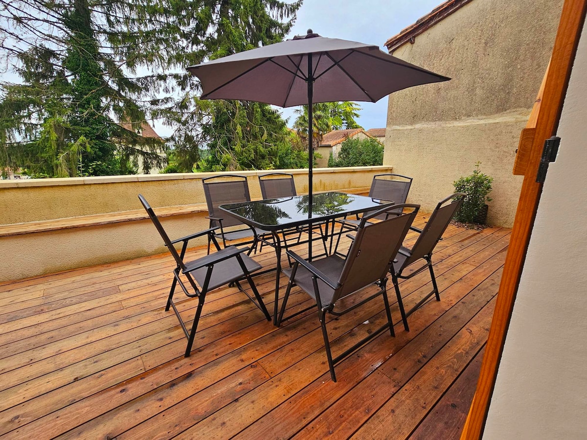 Nyt et elegant og sentralt opphold, nær alle butikker, barer, restauranter, plasser, i det historiske sentrum. Utsikt mot Dronne og slottet. 500 meter fra campingplassen og stranden, tennisbane, kajakkpadling og flere turstier til nabokommunene. Huset har en spisestue, kjøkken og toalett i første etasje, og i andre etasje en balkong med panoramautsikt, bad, toalett, et foreldresoverom og to små rom for tre barn.