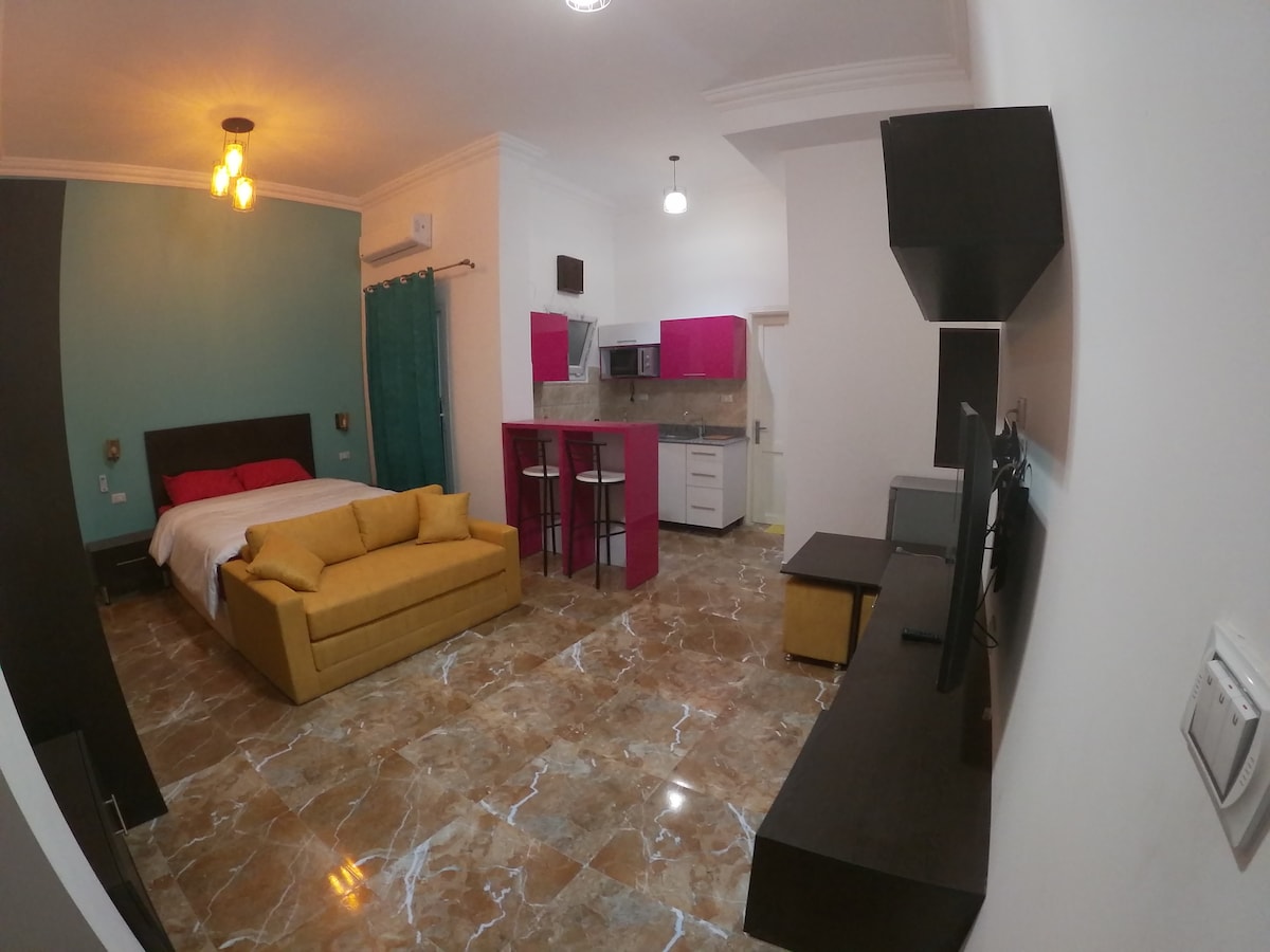 Et solfylt studio rett ved havet med flott havutsikt gjennom vinduet. Den har en direkte beliggenhet ved siden av to strender, en lang promenade for fotturer og bygningen på den offentlige transportlinjen hvor du kan nå alle deler av Hurghada i løpet av minutter, som Sheraton Street, som har mange restauranter og kaféer, samt det gamle Dahar-området i tillegg til et av Hurghadas største kjøpesentre (Hurghada City Centre), som har mange internasjonale merker og Carrefour. Bygningen er moderne, og alle møblene er nye.
