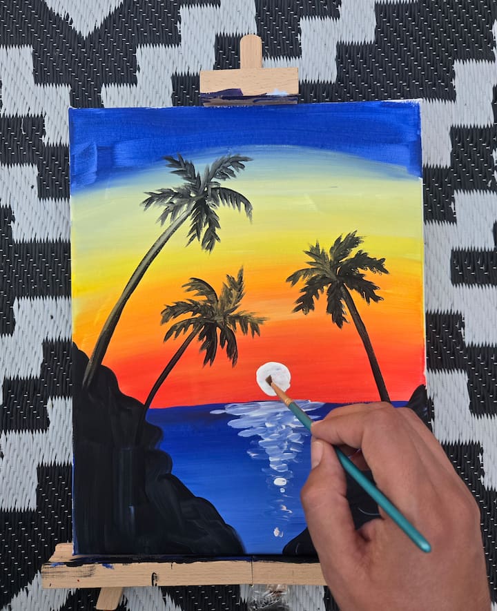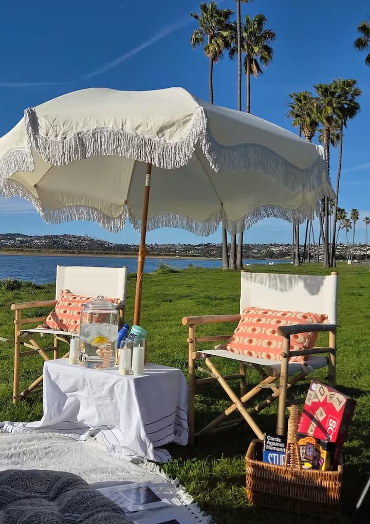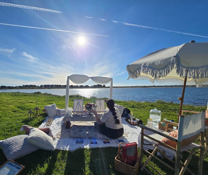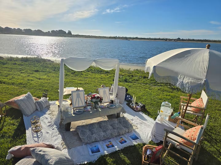 Piknik og kystmaleri ved vannet