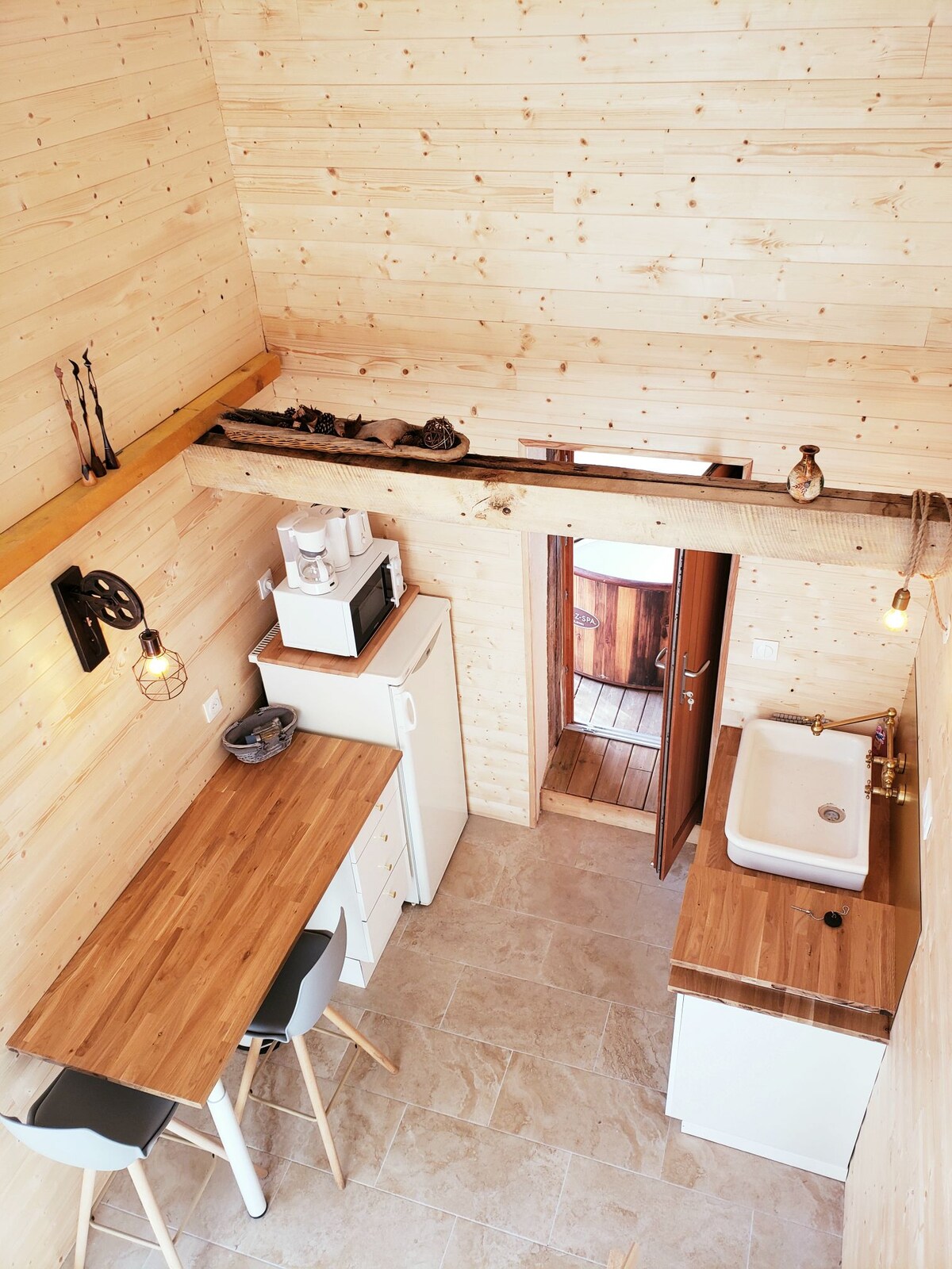 Bienvenue dans cette tiny house où confort et élégance se rencontrent pour un habitat chaleureux, habillé de bois, où chaque espace est pensé et optimisé pour offrir une ambiance cosy. Offre charme et fonctionnalité avec espace cuisine fonctionnelle/ salle de bain wc/ chambre en mezzanine Seconde piece avec salon (canapé-lit 140) salle à manger avec sa grande baie vitrée (peut être froide l'hiver et fermée non accessible ou avec surcout) Donne sur cour Toutes commodités sont accessibles à pied