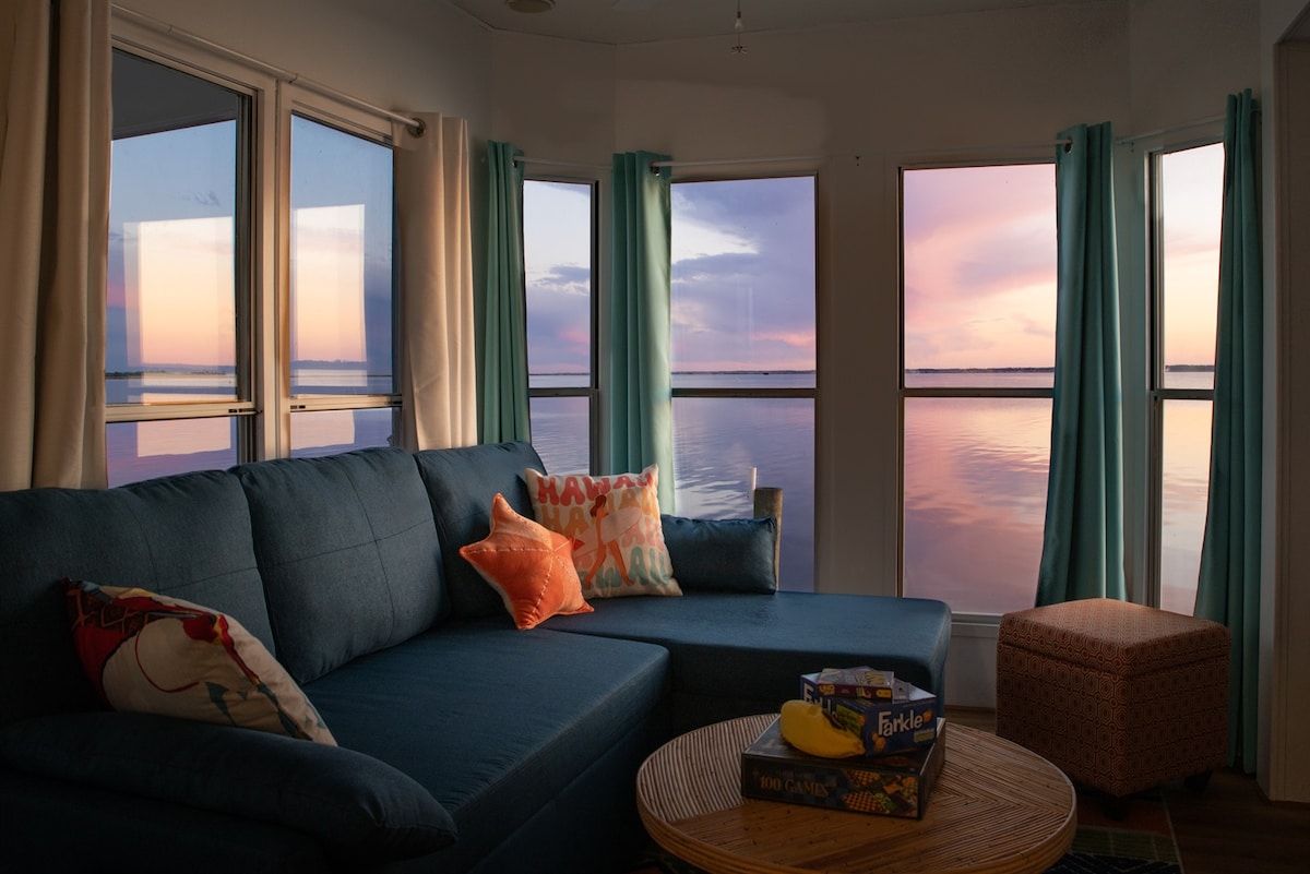 Opplev ro på At The Bend! 🌅 Fantastisk utsikt over vannet og fantastiske solnedganger over bukten. ♨️ Boblebad: slapp av under stjernene og nyt den ultimate avslapningen. 🚤 Privat brygge: perfekt for å fiske, slappe av eller sjøsette kajakken eller kanoen din. 🛏️ Tre soverom – to kingsize-senger og én queensize-seng, ideelt for familier eller venner. 🍳 Fullt utstyrt kjøkken + koselig stue med peis. 🌊 Minutter til strender, spisesteder og attraksjoner i Virginia Beach!