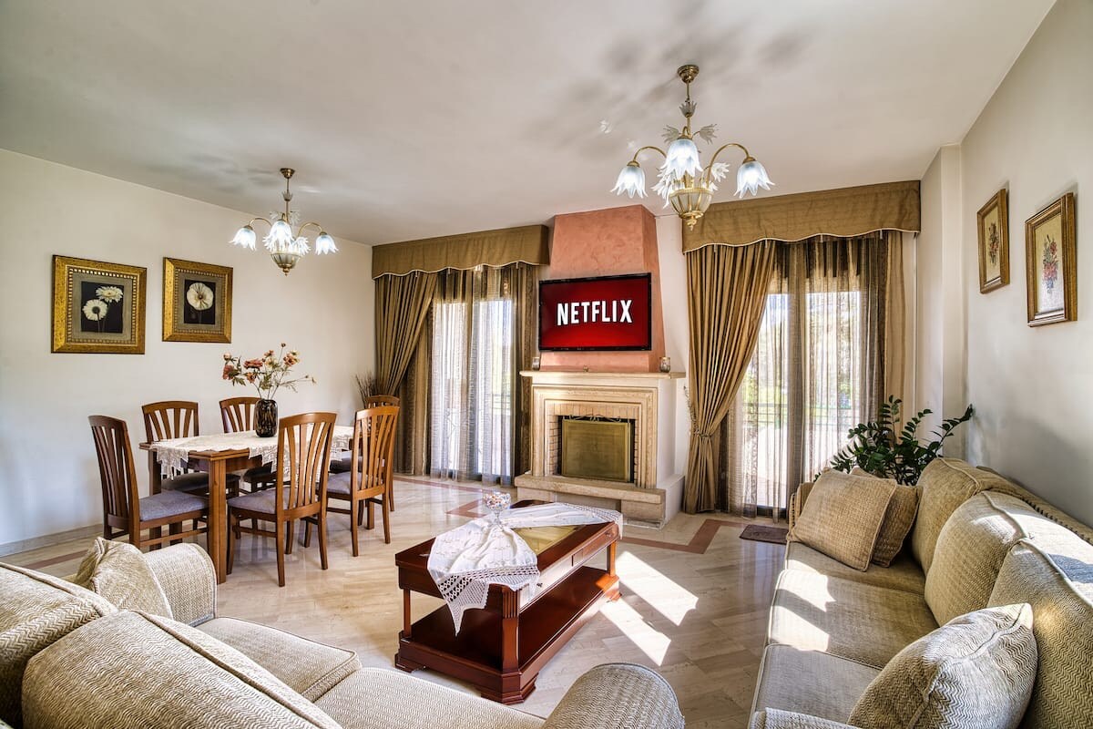 Dette er en villa på 260 m² med fantastisk panoramautsikt over havet og slottet. Beliggende ved siden av sentrum, tre minutter med bil til stranden (ti minutter til fots), fem minutter med bil til gamlebyen (20 minutter til fots). – fem store soverom – fire store balkonger + én stor terrasse på 55 m² med fantastisk utsikt – tre familiebad (ett med et stort badekar) – lekerom med biljard, minifotball, pilskive, kart med mer – én stue (med peis) – bar – et lite kretisk museum – To kjøkken. – Minibibliotek.